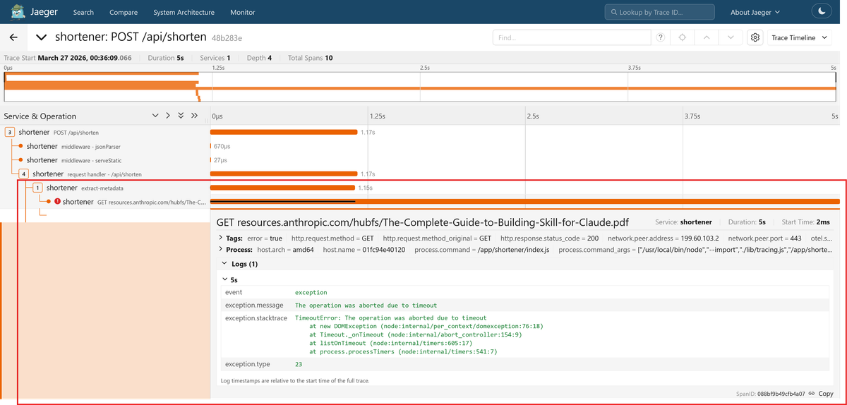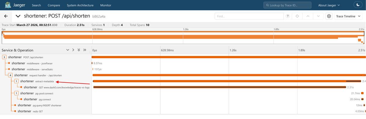 POST /api/shorten request in Jaeger. You should see the extract-metadata