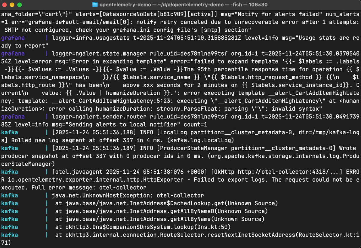 yaml1234567891011# docker-compose.yml# Add this to your existing services blockservices:# [...]otel-collector:image: otel/opentelemetry-collector-contrib:latestcontainer_name: otel-collectorvolumes:- ./otelcol.yaml:/etc/otelcol/config.yamlports:- 8006:8006 # Expose for the Fluentd driver