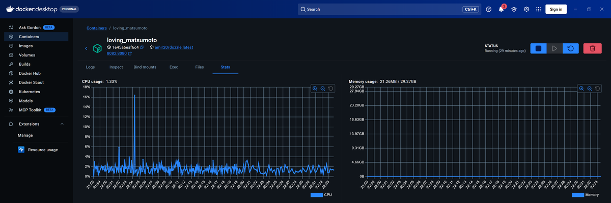 If you're running Docker Desktop, you'll observe that it automatically surfaces container resource metrics without any additional setup in its Containers view (as seen above).