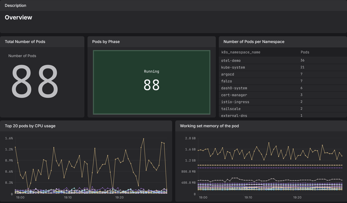 Dash0 is one such backend that serves as a natural destination for these metrics. Because Dash0 is OpenTelemetry-native, you can point the Collector's OTLP exporter directly at your Dash0 endpoint and container metrics start flowing in without any intermediate translation layers or proprietary agents.
