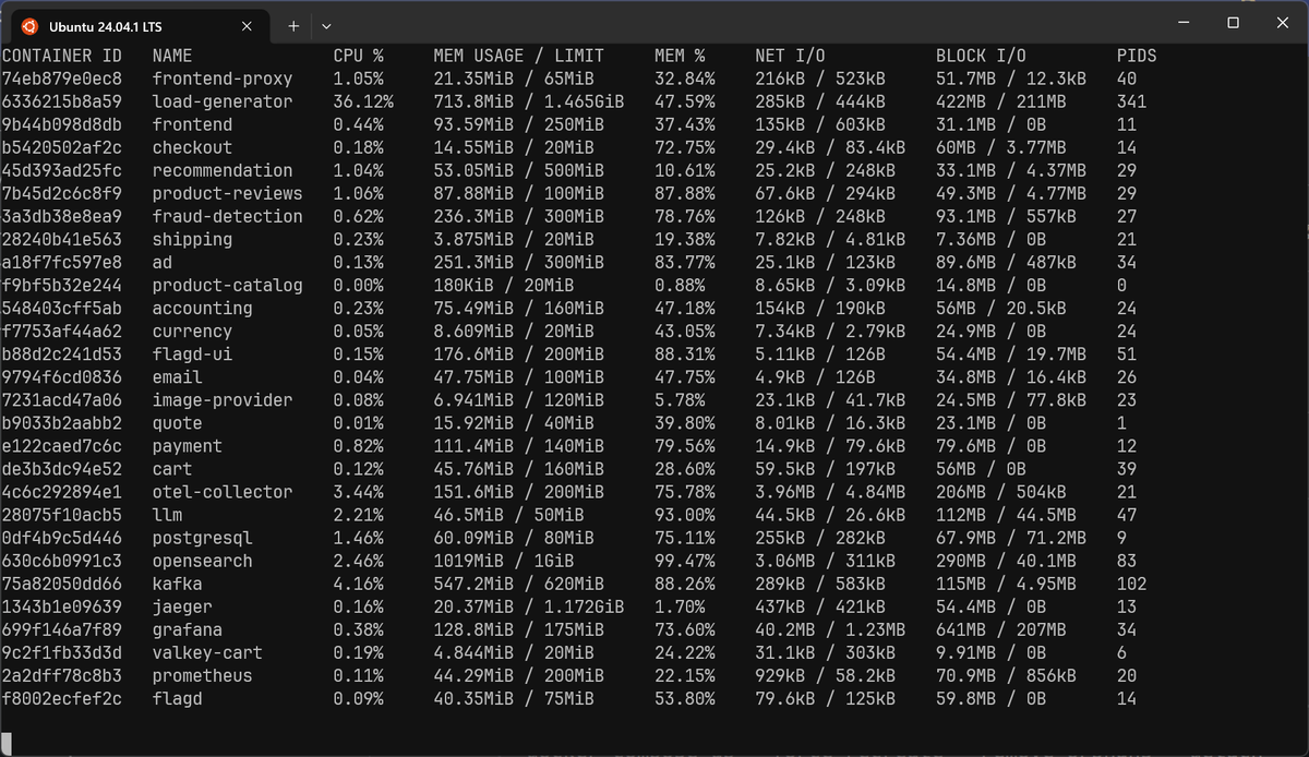 123456789CONTAINER ID NAME CPU % MEM USAGE / LIMIT MEM % NET I/O BLOCK I/O PIDS74eb879e0ec8 frontend-proxy 1.37% 21.3MiB / 65MiB 32.77% 90.4kB / 214kB 51.7MB / 12.3kB 406336215b8a59 load-generator 67.80% 678.2MiB / 1.465GiB 45.22% 83.9kB / 162kB 404MB / 75.7MB 3389b44b098d8db frontend 0.39% 89.68MiB / 250MiB 35.87% 59.7kB / 246kB 31.1MB / 0B 11b5420502af2c checkout 0.05% 14.75MiB / 20MiB 73.75% 18.1kB / 43.9kB 58.3MB / 3.65MB 1445d393ad25fc recommendation 2.72% 53.01MiB / 500MiB 10.60% 14kB / 90.5kB 33.1MB / 4.37MB 297b45d2c6c8f9 product-reviews 1.03% 85.61MiB / 100MiB 85.61% 24.4kB / 89.1kB 47.4MB / 4.71MB 293a3db38e8ea9 fraud-detection 1.10% 233.9MiB / 300MiB 77.96% 50.9kB / 99.1kB 93.1MB / 328kB 27[...]