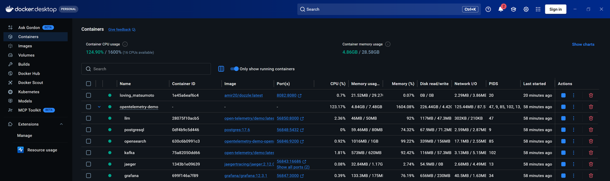 1234567891011NAME CPU % MEM USAGE / LIMITfrontend-proxy 0.95% 21.41MiB / 65MiBload-generator 33.04% 733.9MiB / 1.465GiBfrontend 0.37% 92.53MiB / 250MiBcheckout 0.07% 14.63MiB / 20MiBrecommendation 1.45% 53.14MiB / 500MiBproduct-reviews 1.08% 88.79MiB / 100MiBfraud-detection 0.41% 246.5MiB / 300MiBshipping 0.19% 3.875MiB / 20MiBad 0.13% 259.2MiB / 300MiB[...]