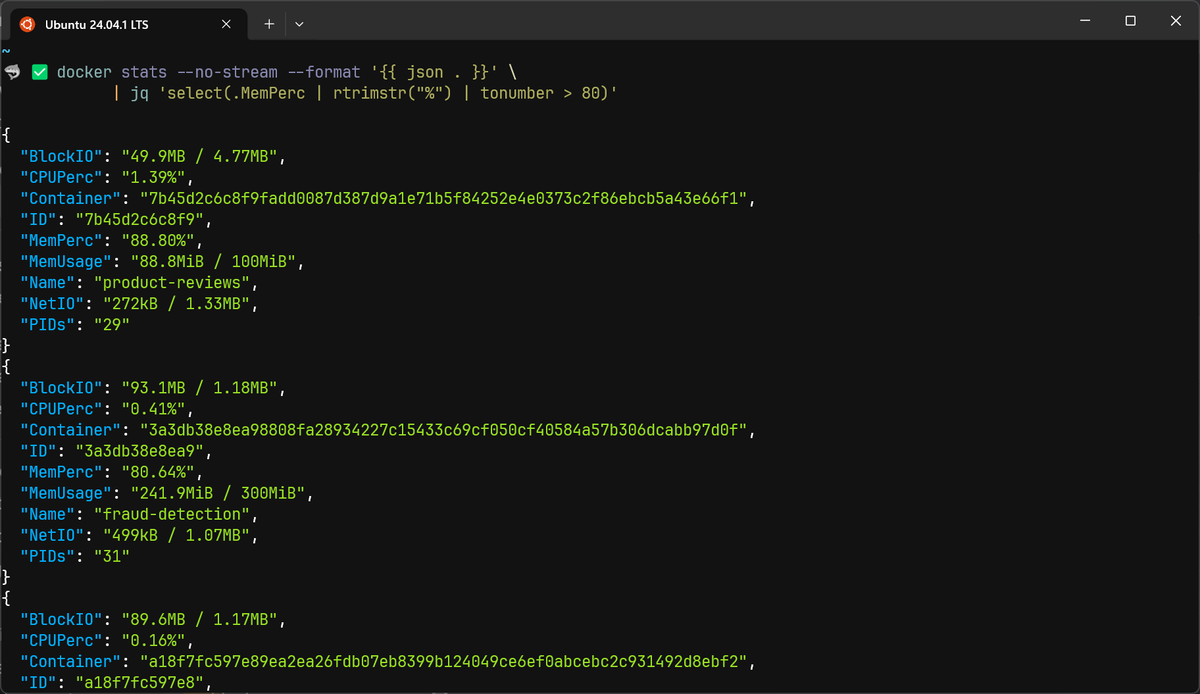 Combining this with --no-stream gives you a clean, single-shot JSON line per