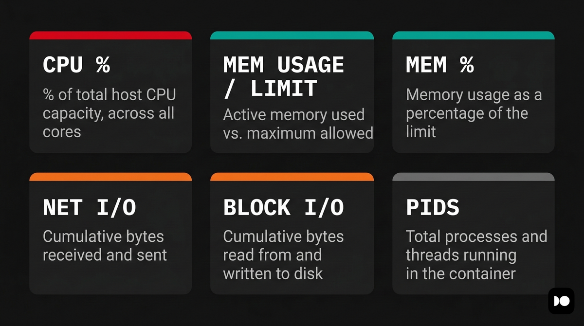 .Containeris the container name or ID (whichever was used in the command)..Nameis the container's name..IDis the container's full ID..CPUPercis the CPU usage percentage..MemUsageis the memory usage and limit..MemPercis the memory usage as a percentage of the limit..NetIOis the cumulative network I/O bytes..BlockIOis the cumulative block I/O bytes..PIDsis the process/thread count.