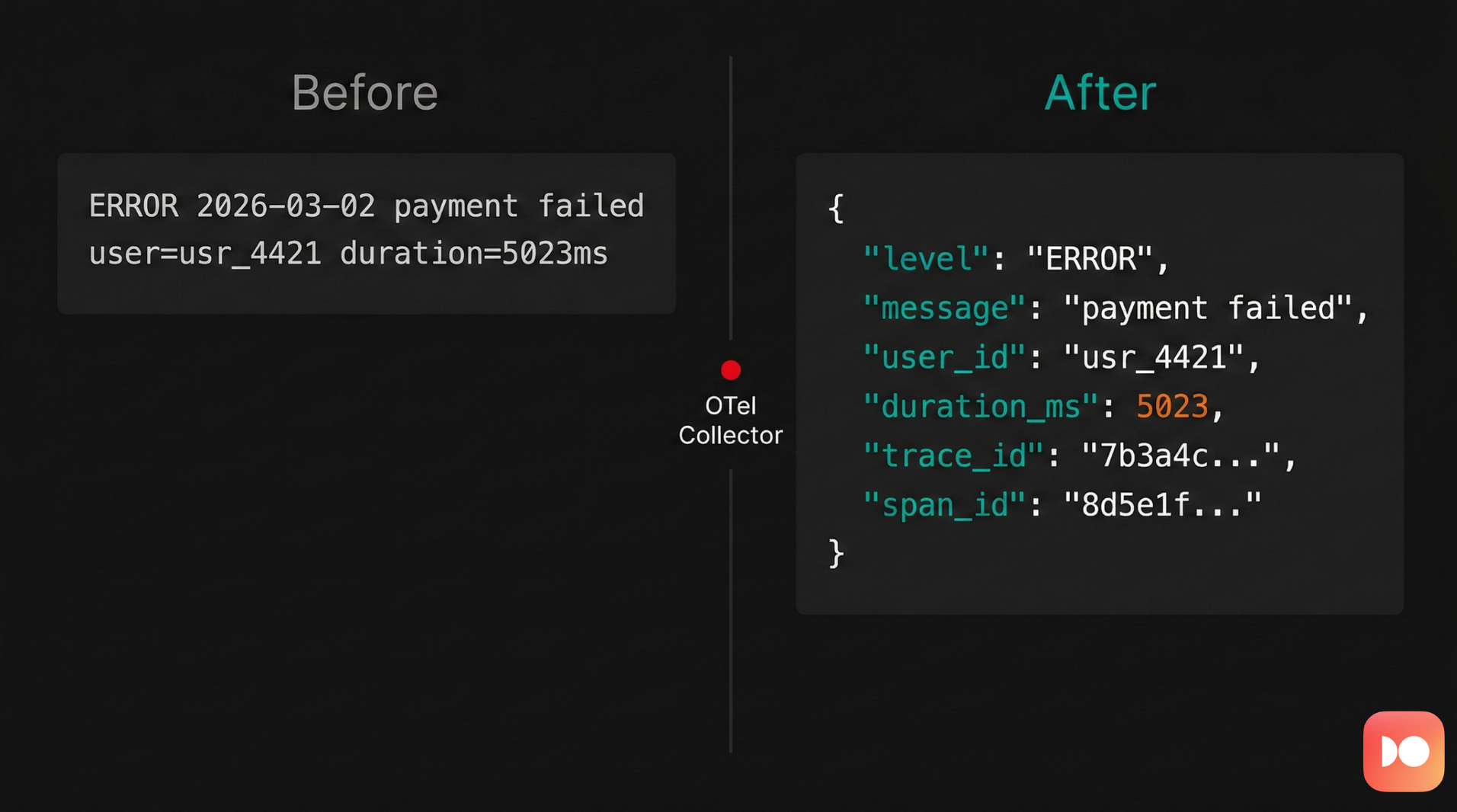 For legacy applications or services that can't be configured to output JSON, your last resort is to parse and transformed the unstructured data as they’re being collected. A tool like the OpenTelemetry Collector can perform these transformations on the fly using components like Filelog receiver or the Transform processor before sending it to your backend.
