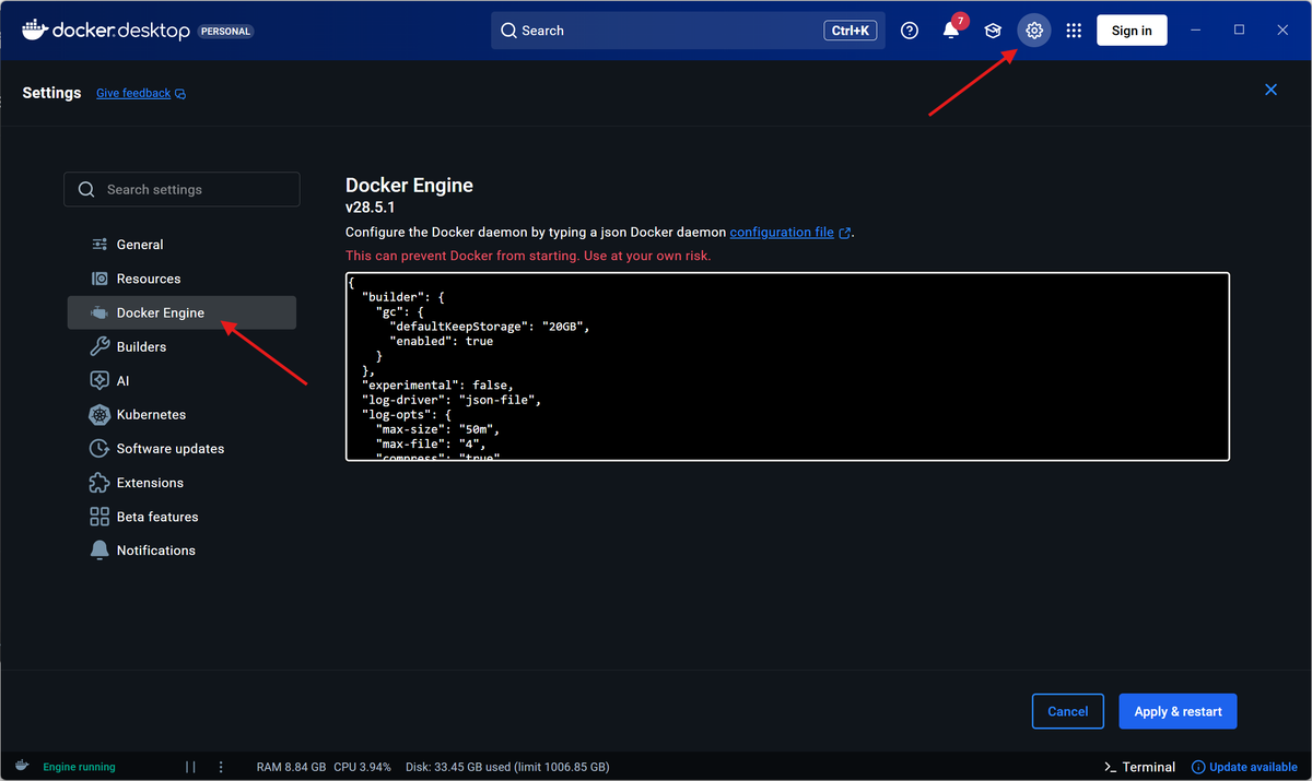 Once you've edited your daemon.json file, you must restart the Docker daemon