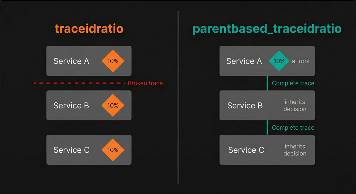 traceidratioinstead ofparentbased_traceidratio. If each service independently applies a sampling ratio without considering the parent span's decision, you'll end up with broken, partial traces. The parent-based variant ensures that once a trace is sampled at the entry point, all downstream services continue to record their part of it. -