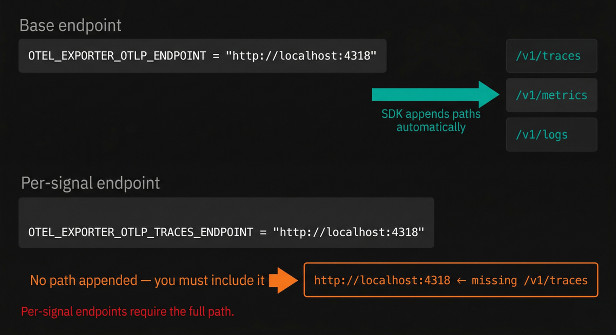 OTEL_EXPORTER_OTLP_ENDPOINTautomatically appends/v1/traces,/v1/metrics, and/v1/logs. The per-signal endpoint variables do not. If you setOTEL_EXPORTER_OTLP_TRACES_ENDPOINTtohttp://localhost:4318and expect it to send tohttp://localhost:4318/v1/traces, you'll be disappointed. The per-signal variable needs the full path. -