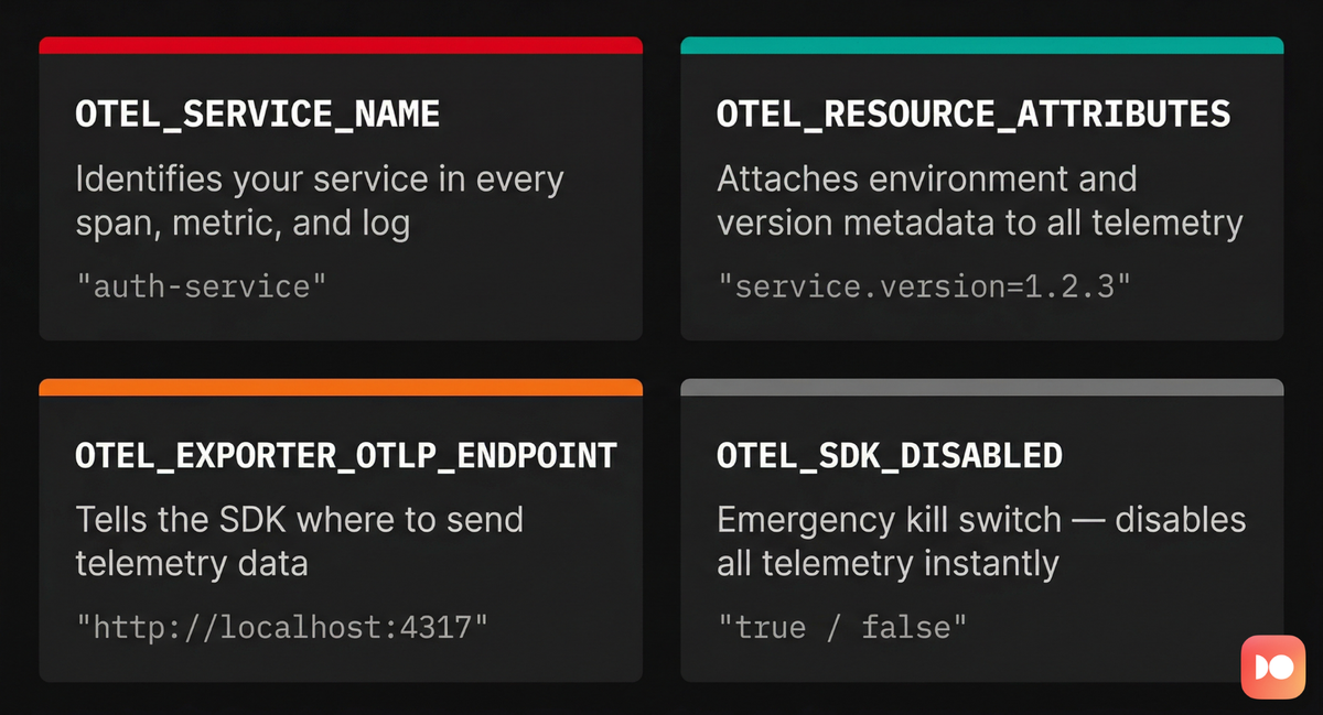 If you remember nothing else about OpenTelemetry environment variables, remember these four. They form the foundation of any reliable telemetry setup, and getting them right from the start will save you hours of debugging later.