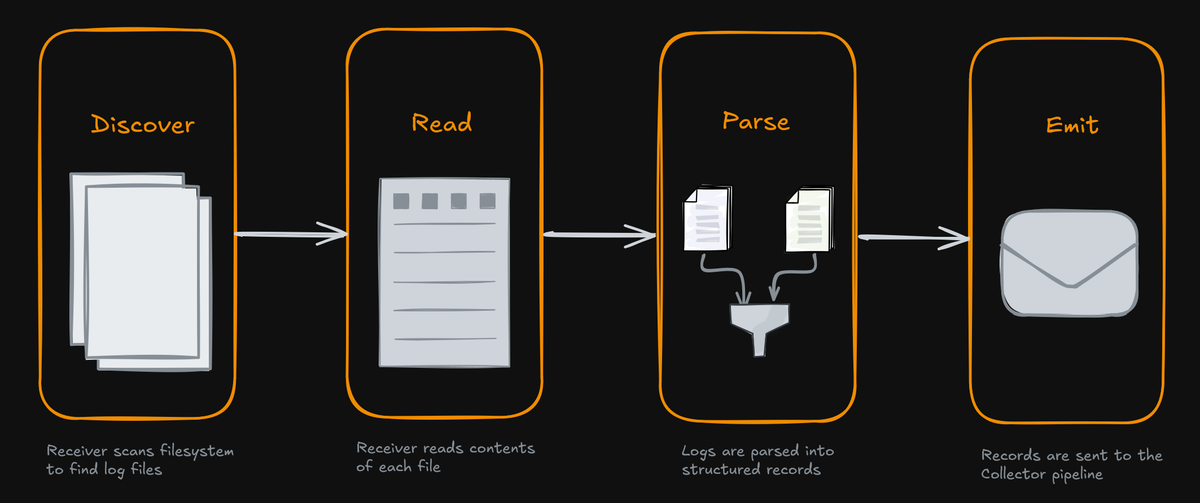 Before we get into configuration details, it helps to picture how the receiver handles a log file throughout its lifecycle. You can think of it as a simple repeating four-step loop: