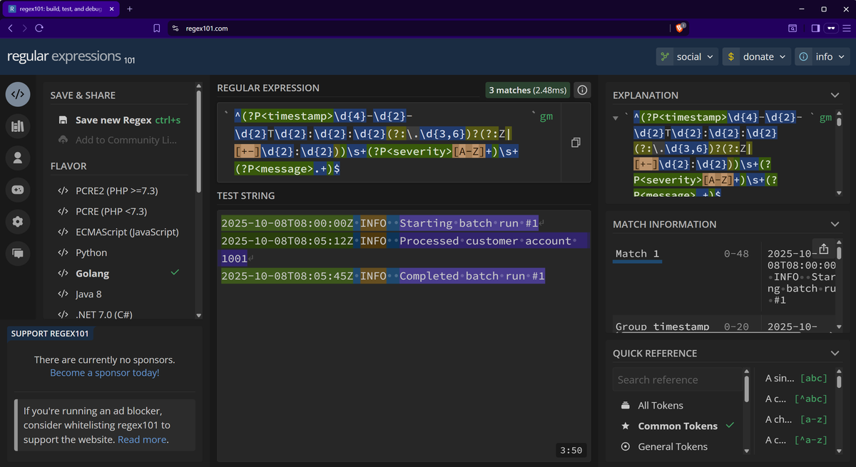 Before adjusting your Collector config, test the regex outside of it using a tool like Regex101. Make sure to select the Golang flavor so it behaves the same way as the Collector's regex engine.