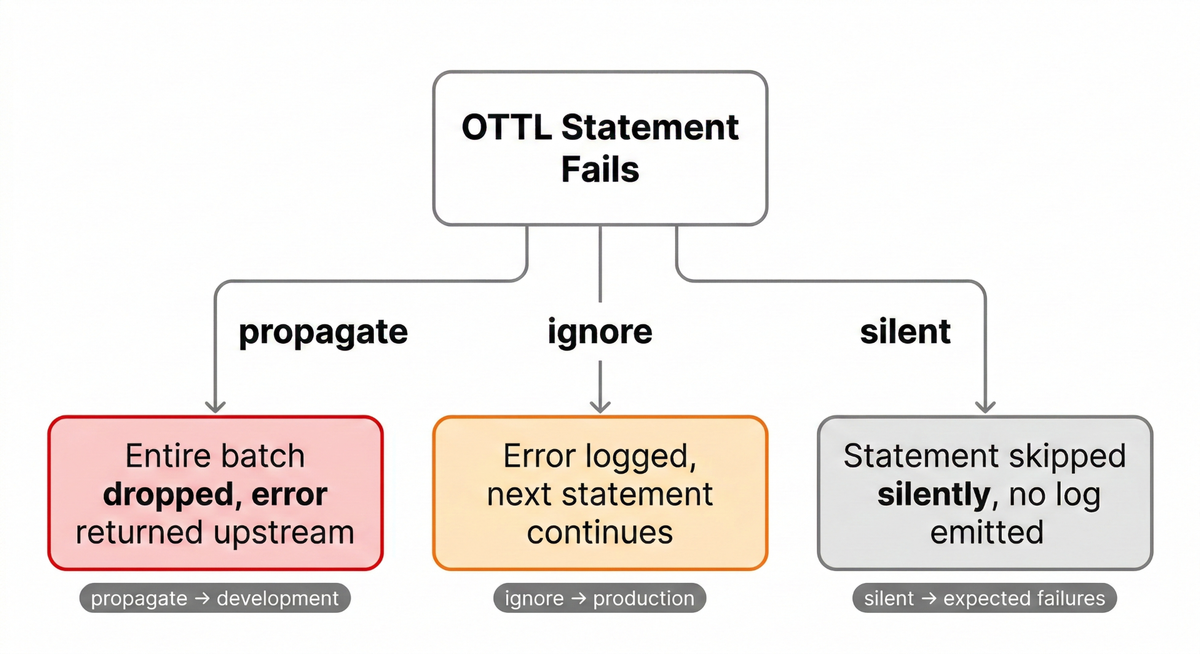 12345678transform:error_mode: ignore # safe default for most statementslog_statements:- error_mode: propagate # this group must succeed or the batch is droppedstatements:- set(log.attributes["account_id"], log.attributes["required_account_id"])- statements: # inherits top-level "ignore"- set(log.attributes["region"], resource.attributes["cloud.region"])