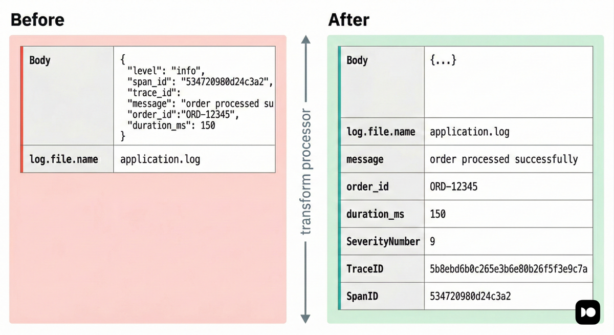 The transform processor allows you to parse that JSON, extract its fields, and map them into proper OpenTelemetry log attributes and context fields in a single, centralized step.