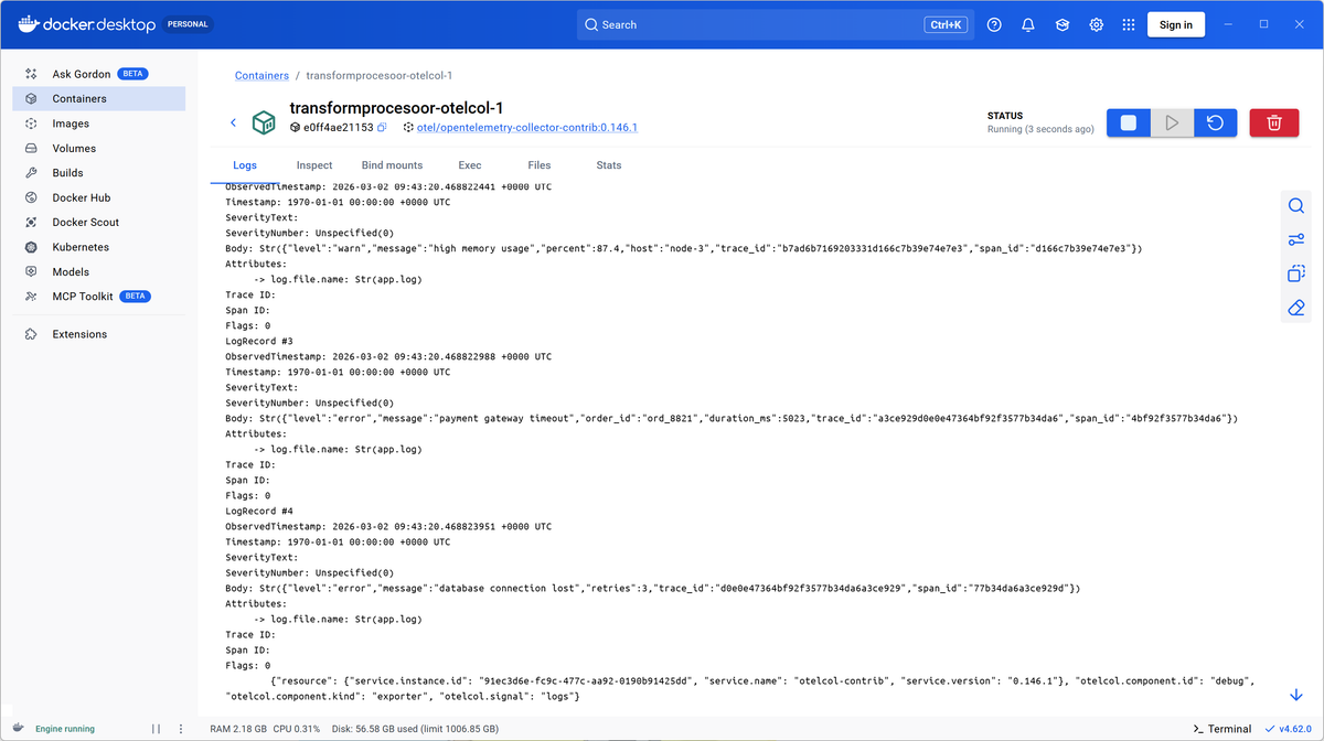 123456789101112131415LogRecord #3ObservedTimestamp: 2026-03-02 07:01:01.578273845 +0000 UTCTimestamp: 1970-01-01 00:00:00 +0000 UTCSeverityText: errorSeverityNumber: Error(17)Body: Str({"level":"error","message":"payment gateway timeout","order_id":"ord_8821","duration_ms":5023,"trace_id":"a3ce929d0e0e47364bf92f3577b34da6","span_id":"4bf92f3577b34da6"})Attributes:-> log.file.name: Str(app.log)-> level: Str(error)-> message: Str(payment gateway timeout)-> order_id: Str(ord_8821)-> duration_ms: Double(5023)Trace ID: a3ce929d0e0e47364bf92f3577b34da6Span ID: 4bf92f3577b34da6Flags: 0