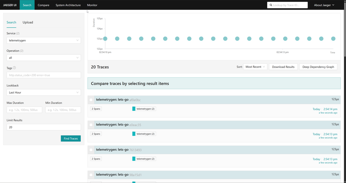 yaml1234567891011121314151617181920212223services:otelcol:image: otel/opentelemetry-collector-contrib:0.136.0container_name: otelcolvolumes:- ./otelcol.yaml:/etc/otelcol-contrib/config.yamlrestart: unless-stoppeddepends_on:- jaegerjaeger:image: jaegertracing/jaeger:2.10.0container_name: jaegerports:- 16686:16686telemetrygen:image: ghcr.io/open-telemetry/opentelemetry-collector-contrib/telemetrygen:v0.136.0container_name: telemetrygenrestart: unless-stoppedcommand: ["traces", "--rate", "10", "--duration", "1h", "--otlp-endpoint", "otelcol:4317", "--otlp-insecure"]depends_on:- otelcol