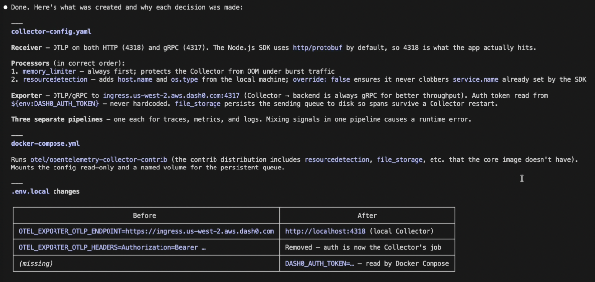 Set up an OpenTelemetry Collector configuration that receives traces from my app and forwards them to Dash0The otel-collector skill generates a complete, production-ready collector-config.yaml and a docker-compose.yml to run it locally. The screenshot below shows the agent's explanation of every decision it made such as the processor ordering, why gRPC is used for the Dash0 connection, why file_storage is included for queue persistence, along with a before/after table of the .env.local changes that route the application through the local Collector instead of directly to Dash0.