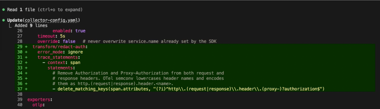 Auto-instrumentation captures HTTP request and response headers by default. This is useful for debugging, but it creates a security risk. If your service passes Bearer tokens or API keys in outbound request headers, those values will appear in your traces. The right place to strip them is in the Collector, before anything leaves your infrastructure.