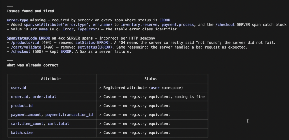 The screenshot below shows the full audit output from the checkout service. The agent identified both issues, explained exactly why each one was wrong, fixed them, and produced a table showing every other attribute that was already correct — confirming that user.id, order.id, payment.amount, and the other custom attributes all have valid names with no registry equivalent to replace them with.