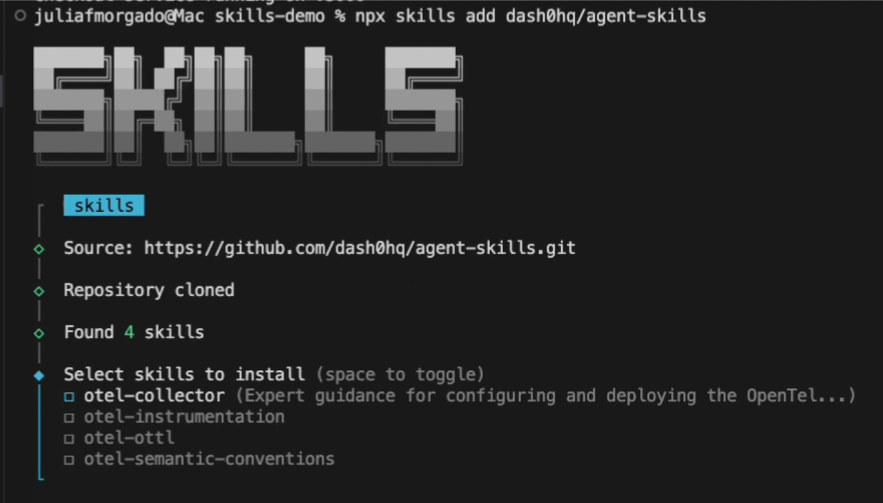 Dash0 Agent Skills fix this at the source. They are packaged instructions that plug directly into your AI coding agent and give it the OTel knowledge it needs to get instrumentation right from the start. The guidance is grounded in semantic conventions, real-world Collector patterns, and the kind of rules that normally live in internal runbooks that nobody reads until something goes wrong.