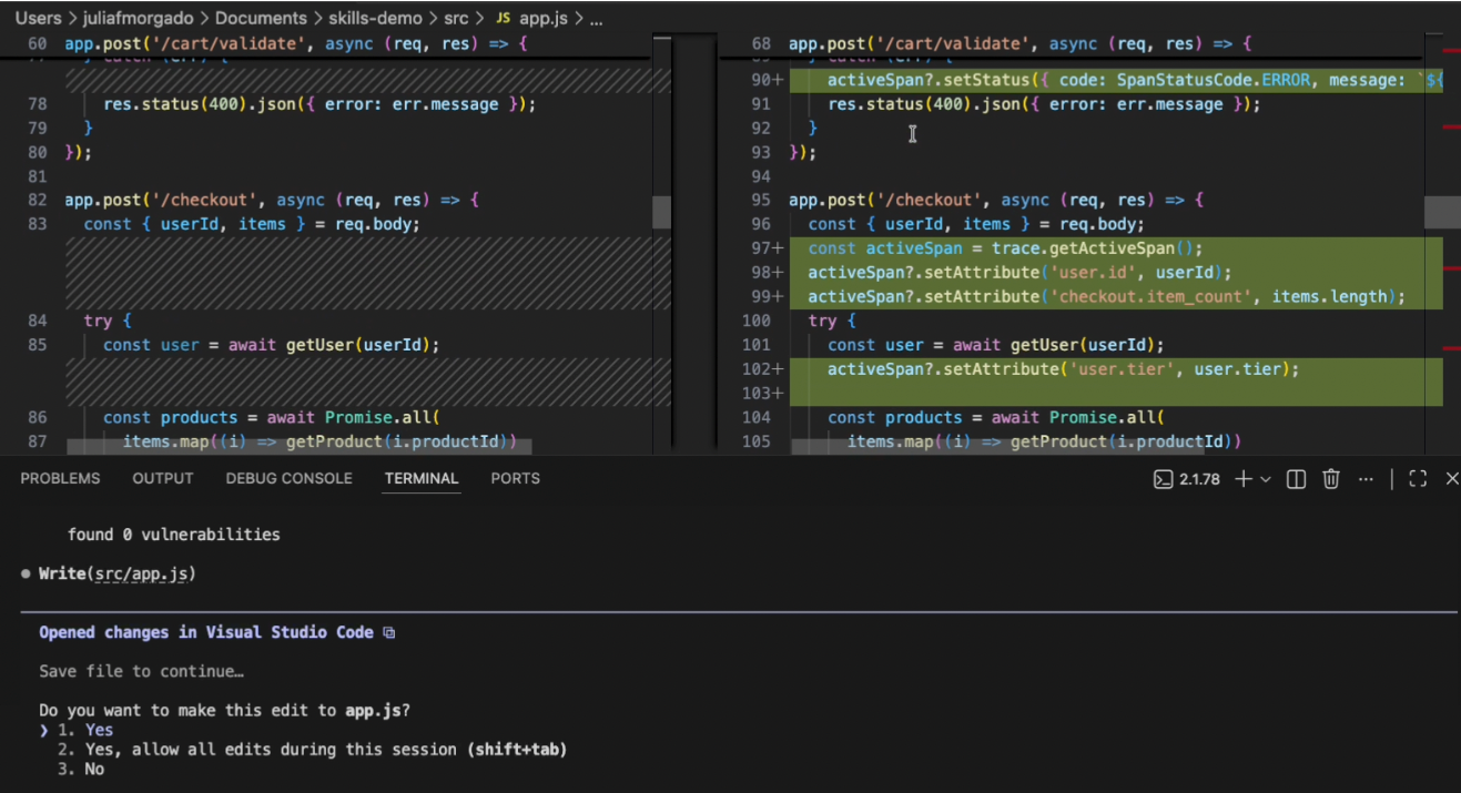 The diff below shows how the agent modifies the checkout route. On the left is the original, minimal Express handler. On the right, the agent enhances it by using trace.getActiveSpan() to attach business context directly to the auto-instrumented HTTP span, such as user.id, user.tier, and checkout.item_count, and by wrapping critical operations in named child spans with proper error handling.