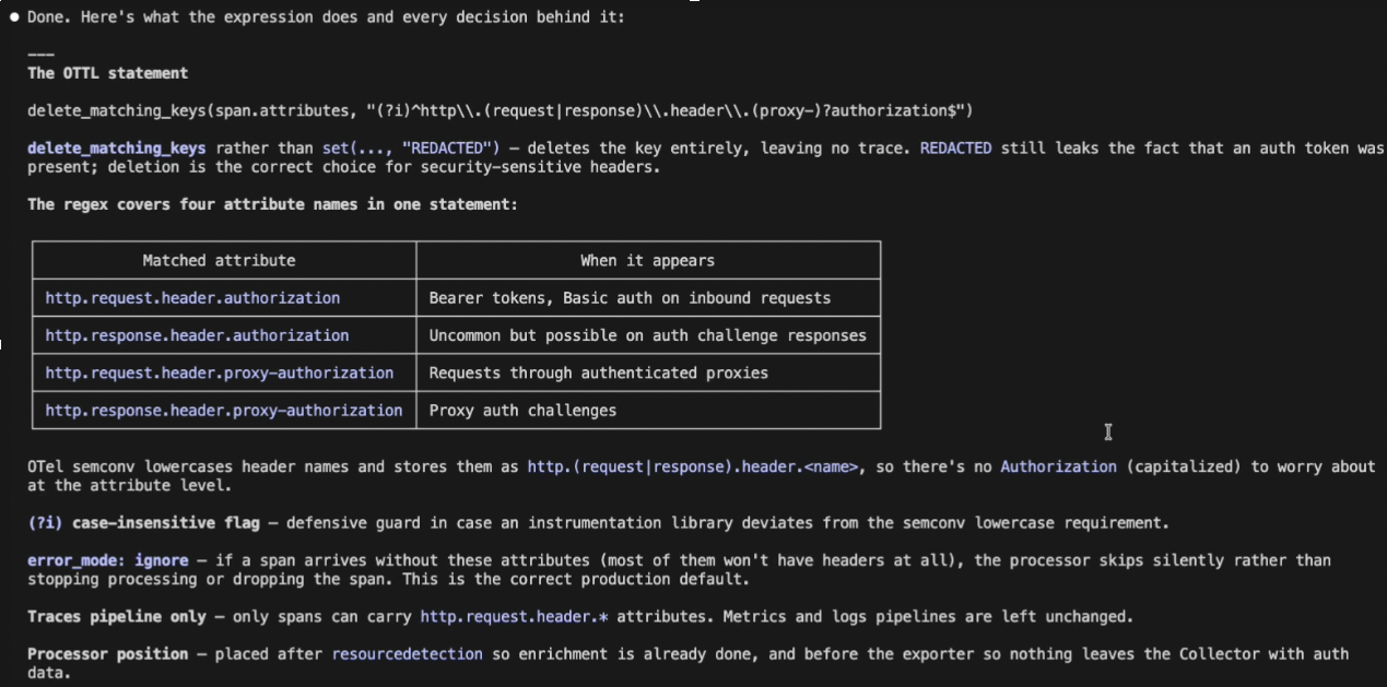 The screenshot below shows the generated OTTL statement, a table of the four header variants it covers in a single regex, and the reasoning behind each decision, including why the processor is placed after resourcedetection and before the exporter, and why error_mode: ignore is the correct production default.