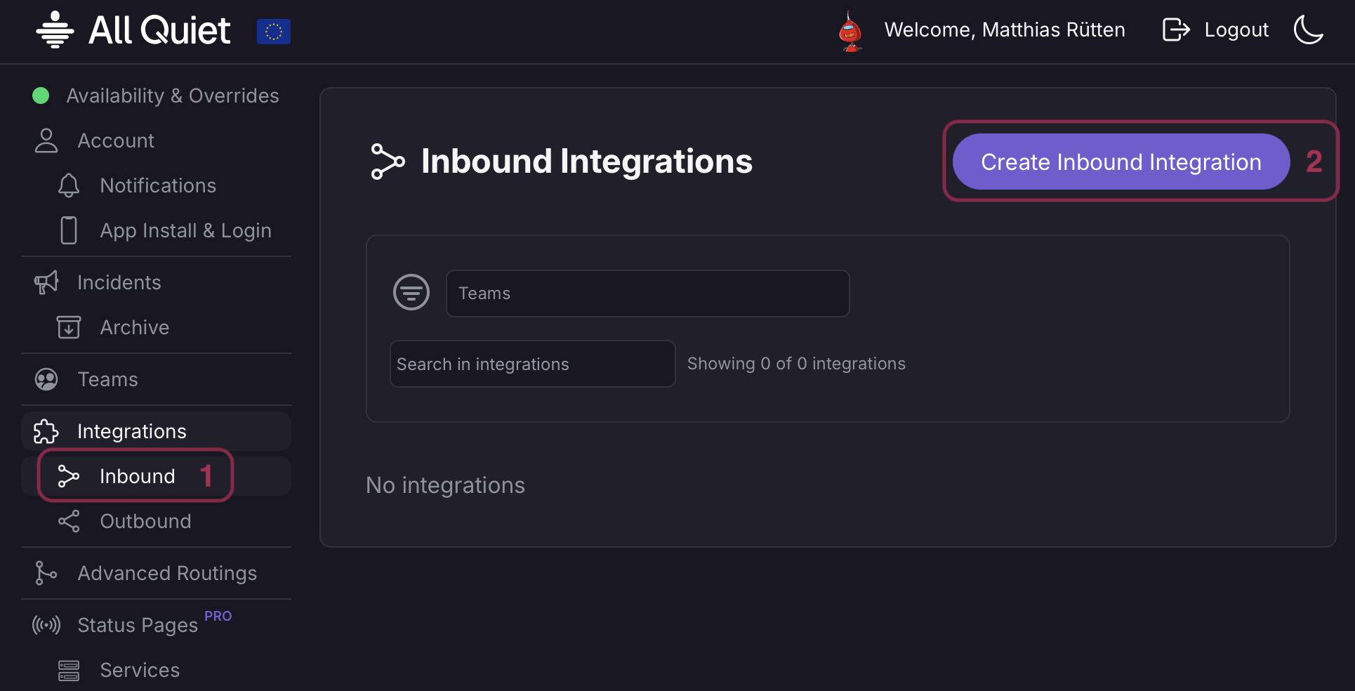 Go to Integrations > Inbound (1) and select Create Inbound Integration (2).