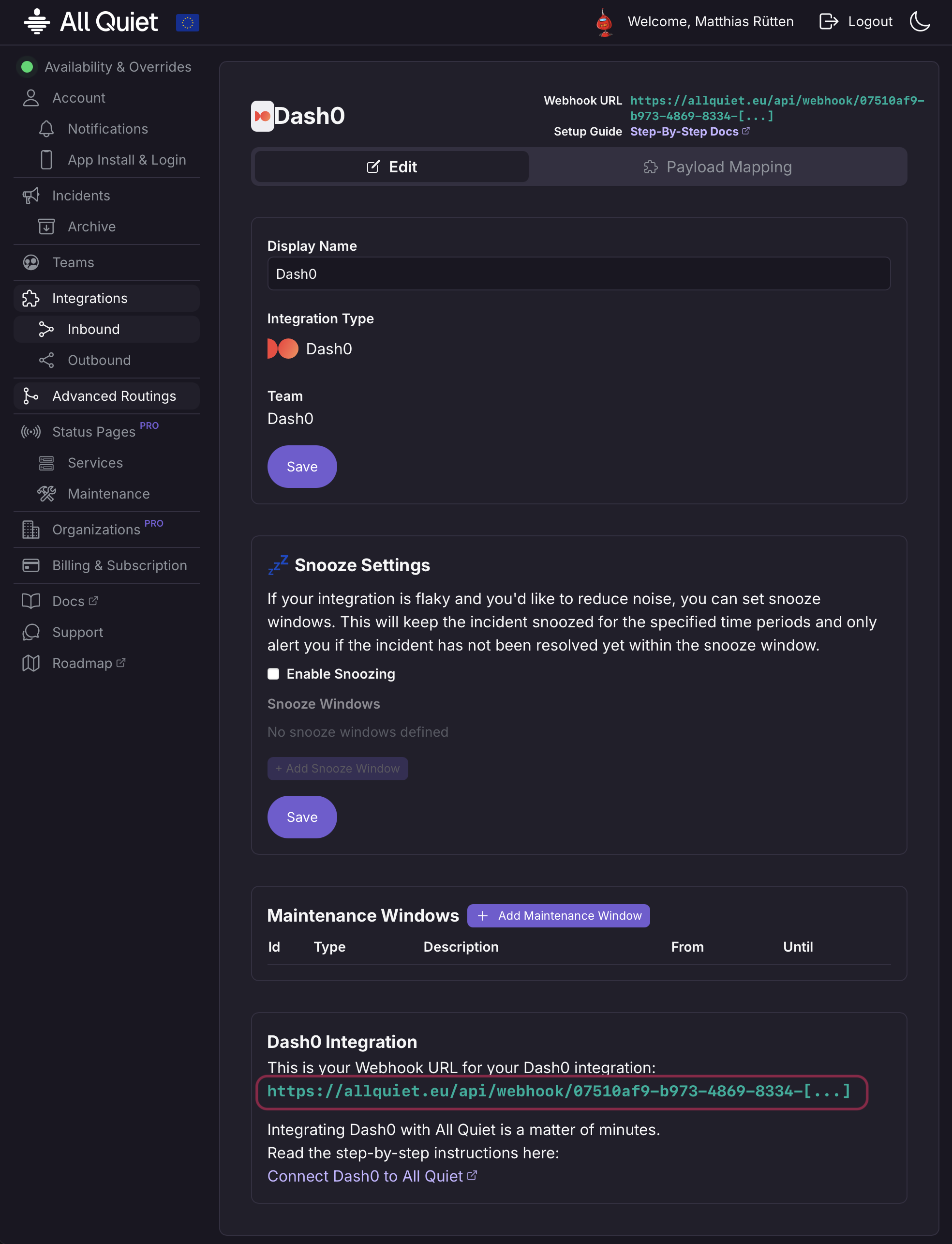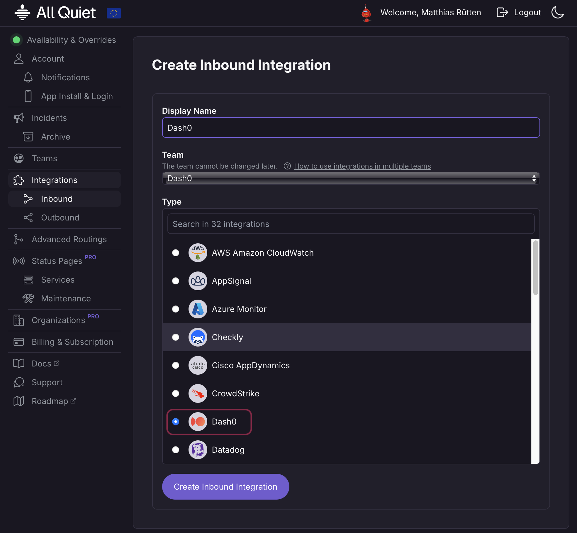 Use this channel to send notifications to All Quiet that helps your users to manage and resolve Dash0 issues faster and more efficient.