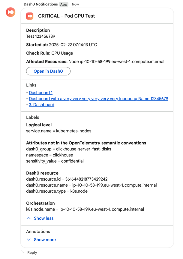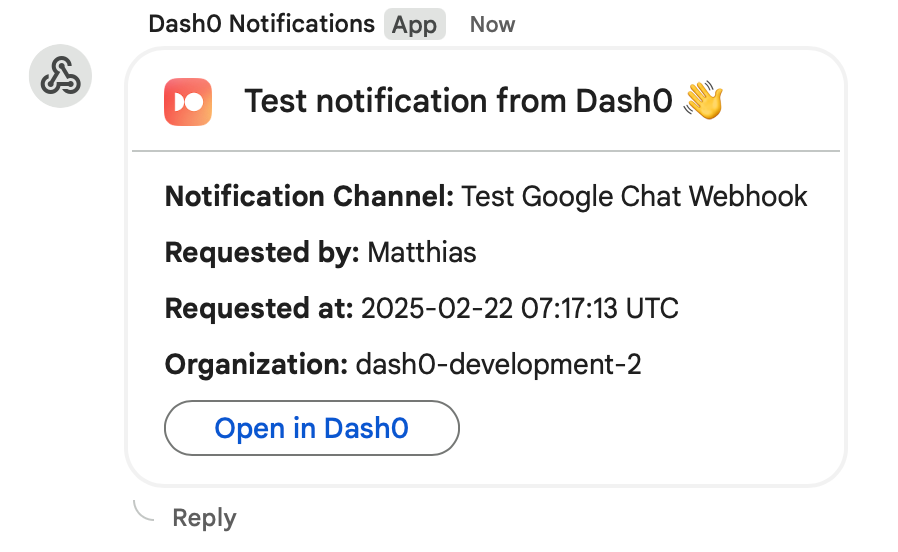 Use the Dash0 Google Chat integration to receive notifications directly within a Google Chat Space when your alerts are firing.