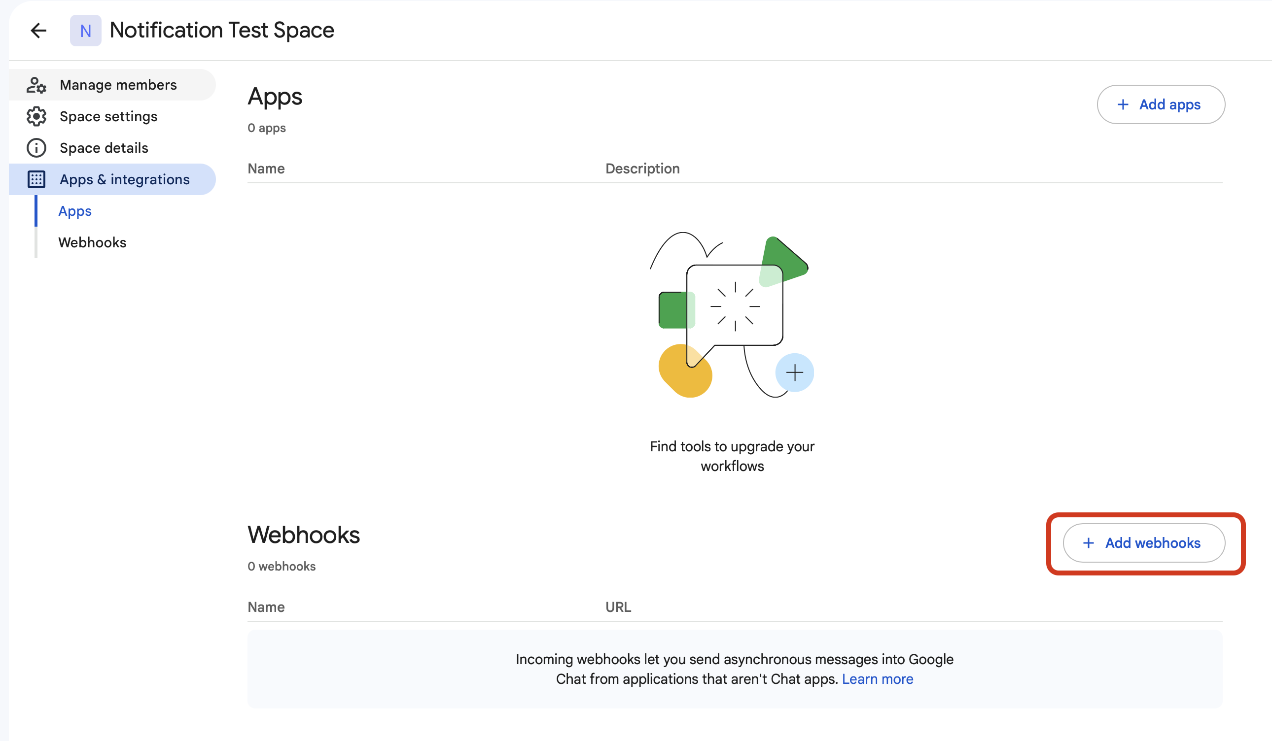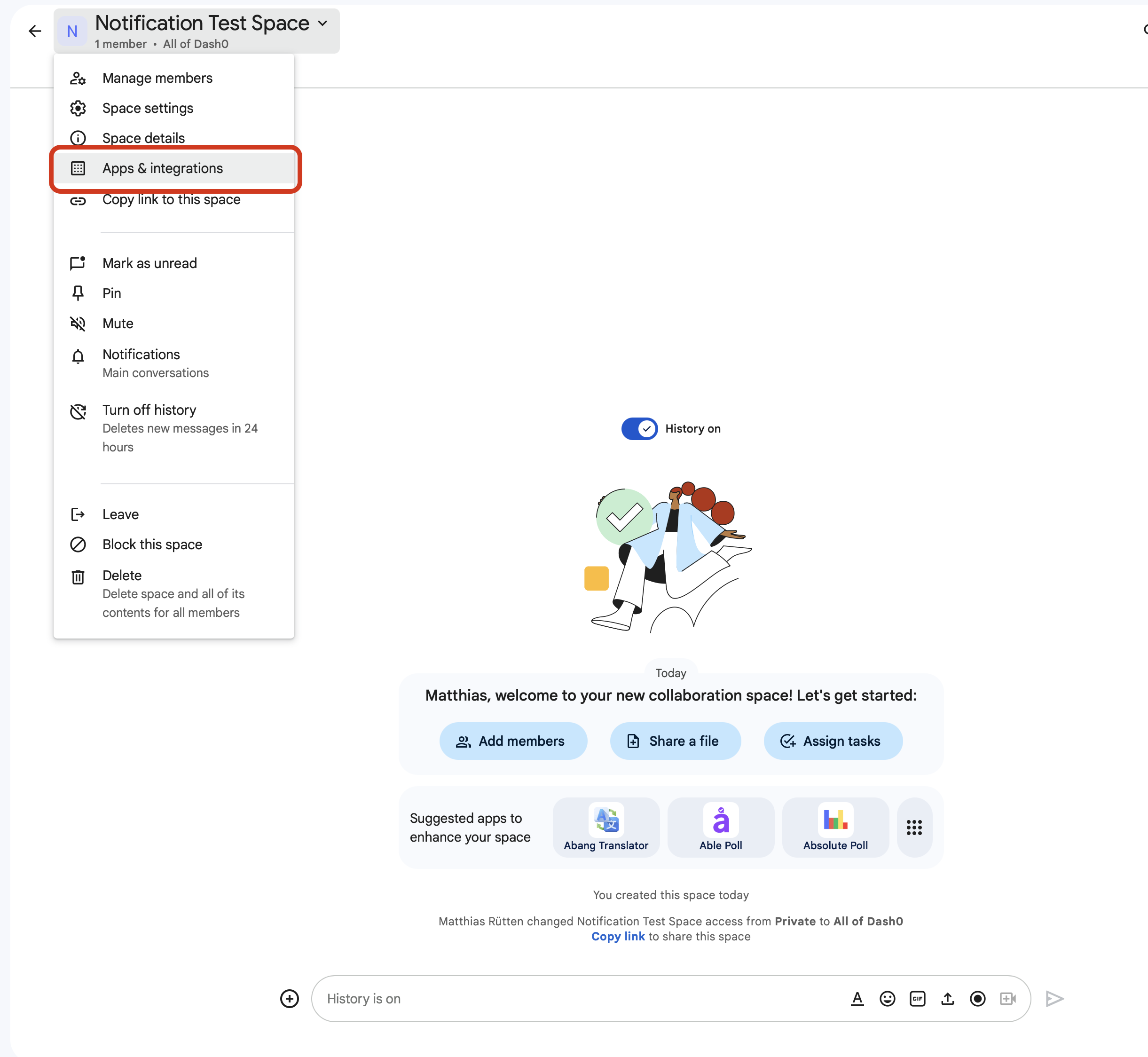Go to the Space to which you want to add the webhook and open the Apps & integration settings.