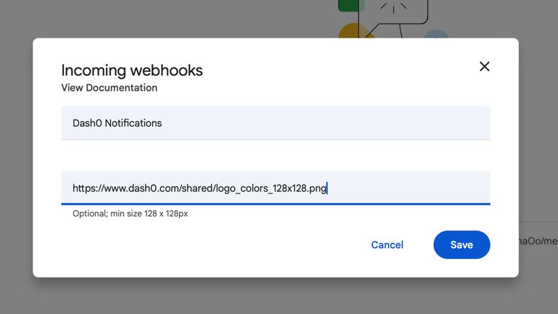 Choose a Name like Dash0 Notifications and Avatar URL. Pick as Avatar URL https://www.dash0.com/shared/logo_colors_128x128.png to use the Dash0 logo.