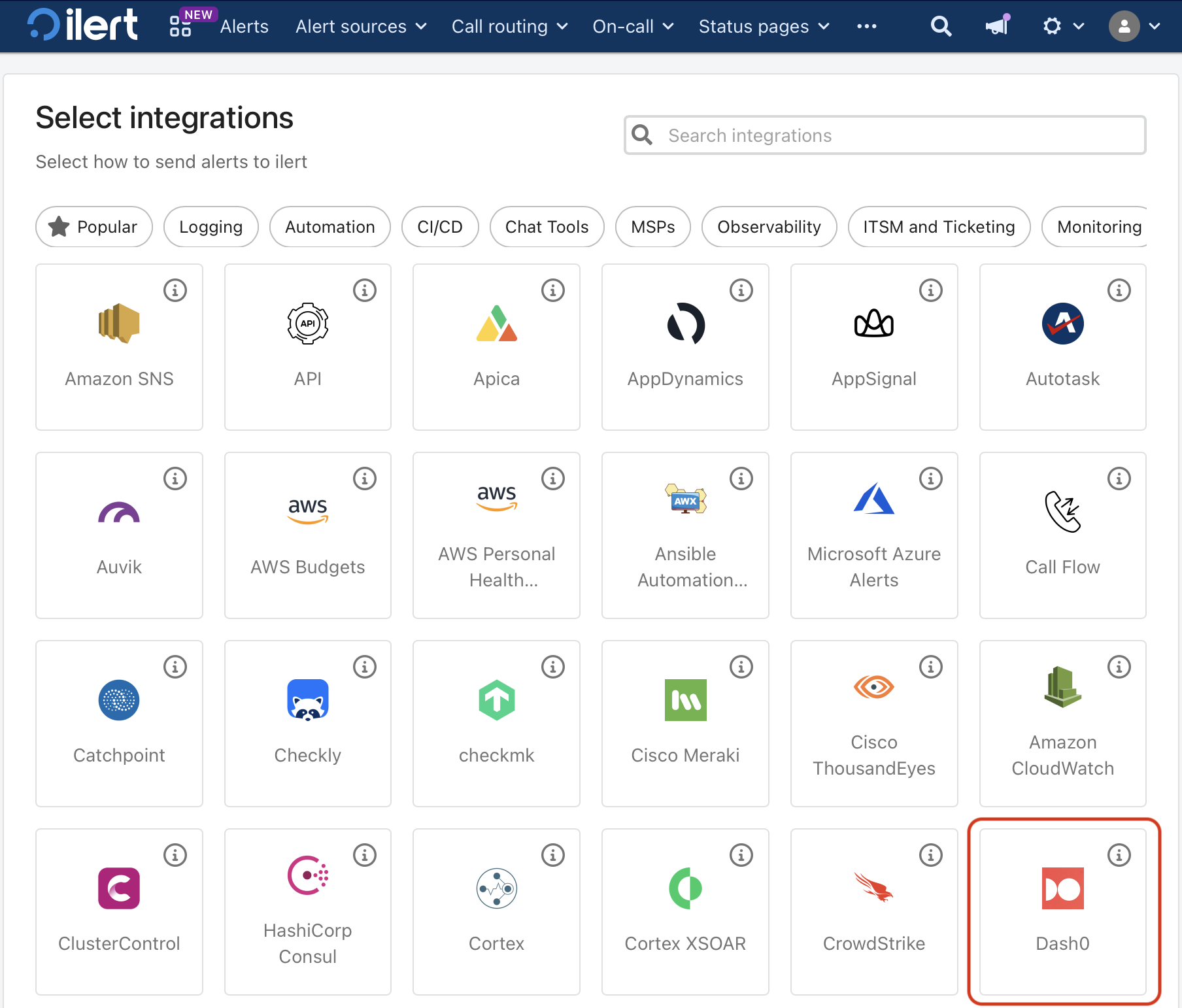 Select Dash0 as integration and configure your new Dash0 integration