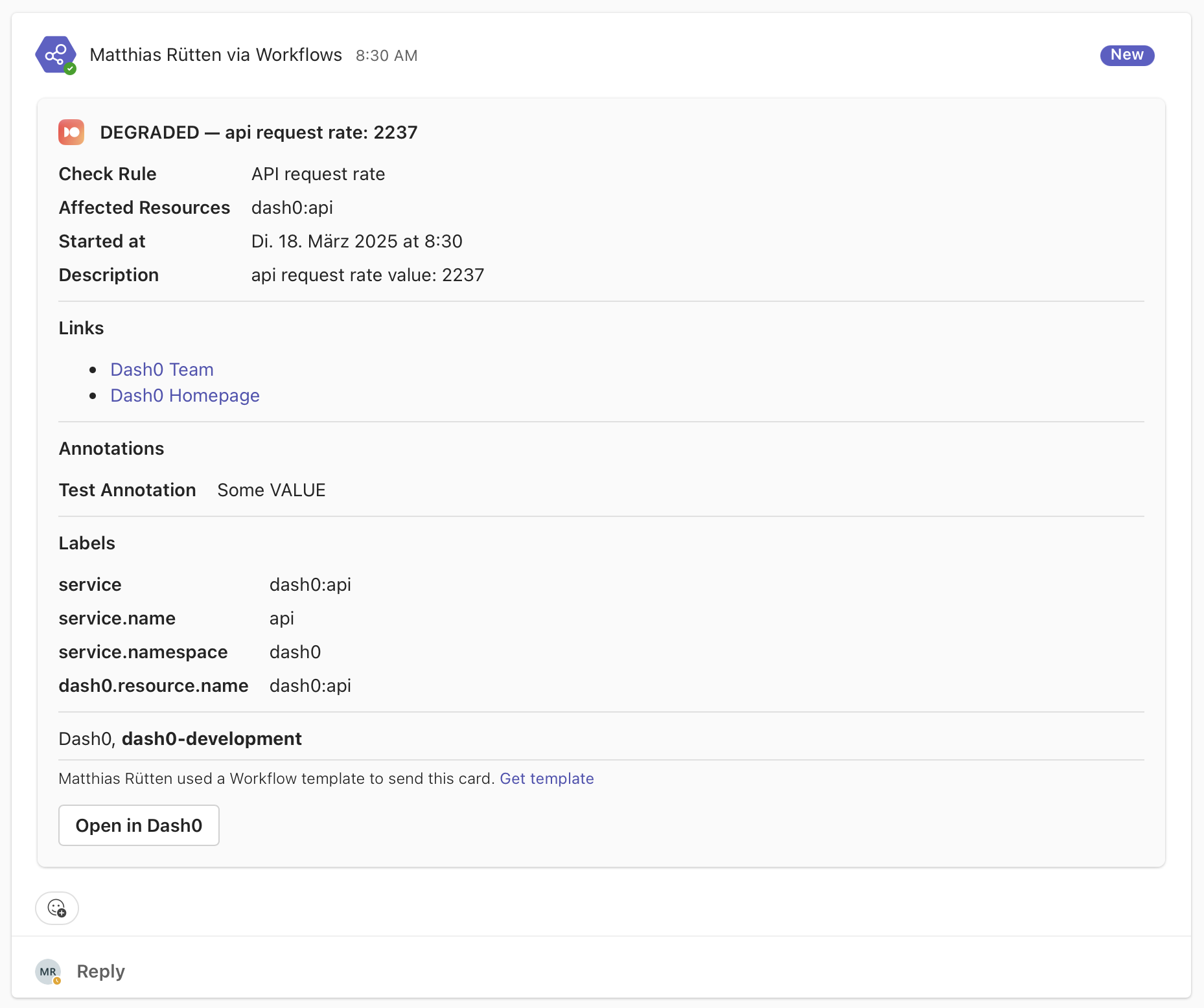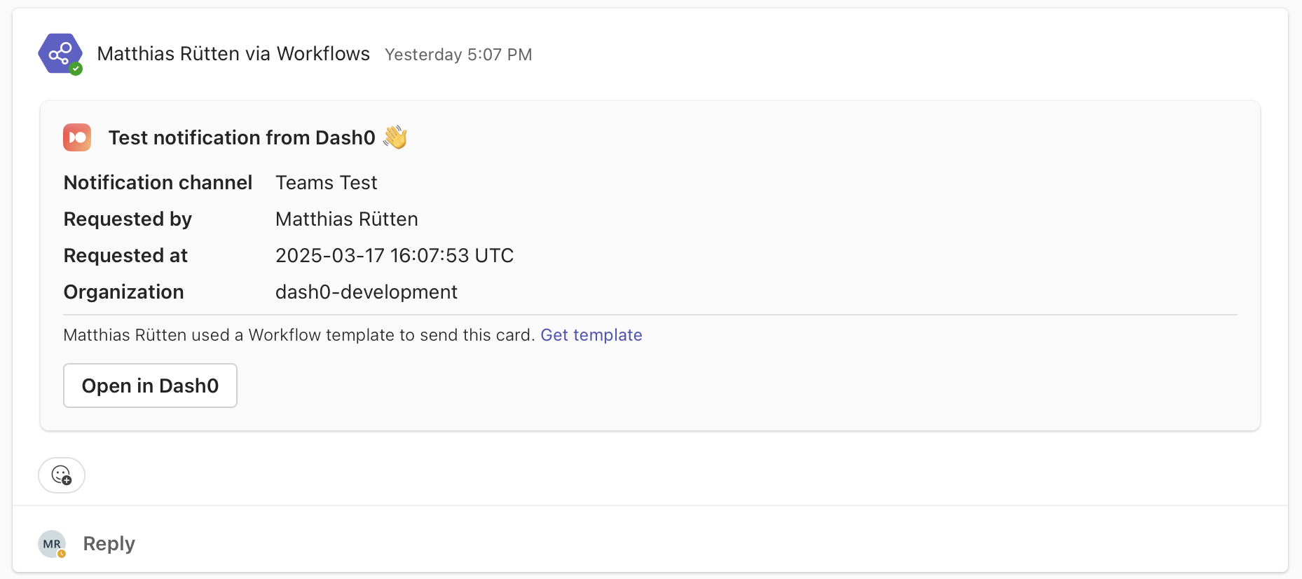 Use the Dash0 Microsoft Teams integration to receive notifications directly within a Microsoft Teams Channel when your alerts are firing.