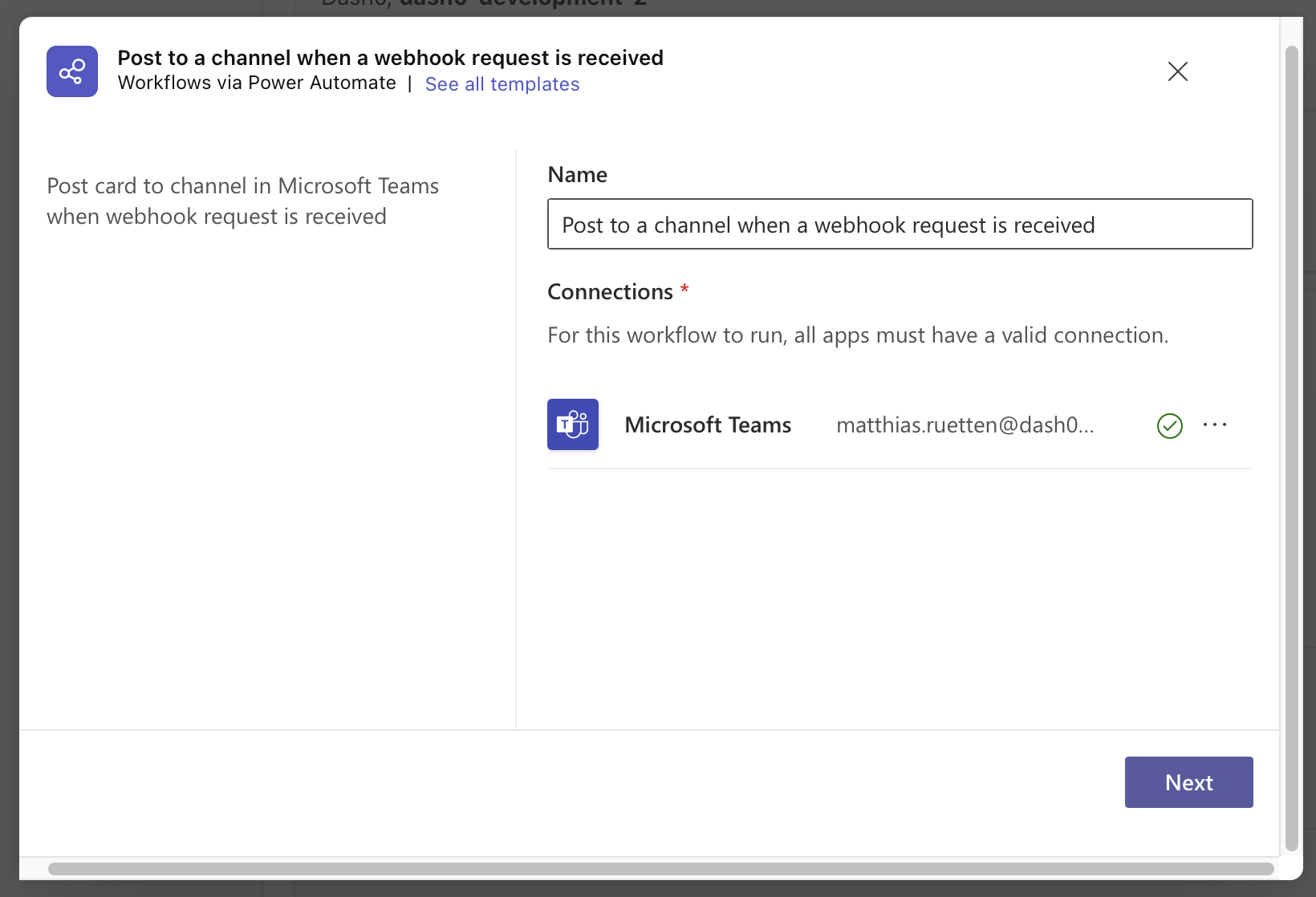 Wait until Microsoft Teams created the connection and click on Next.