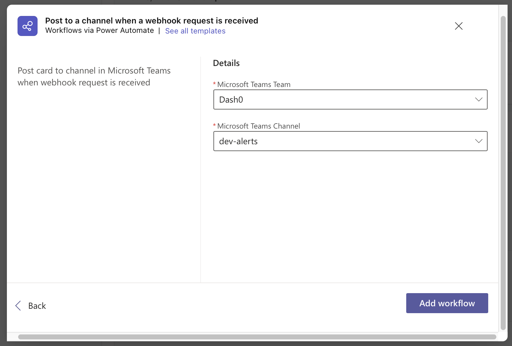 Check if the selected Team and Channel are correct and click on Add workflow.