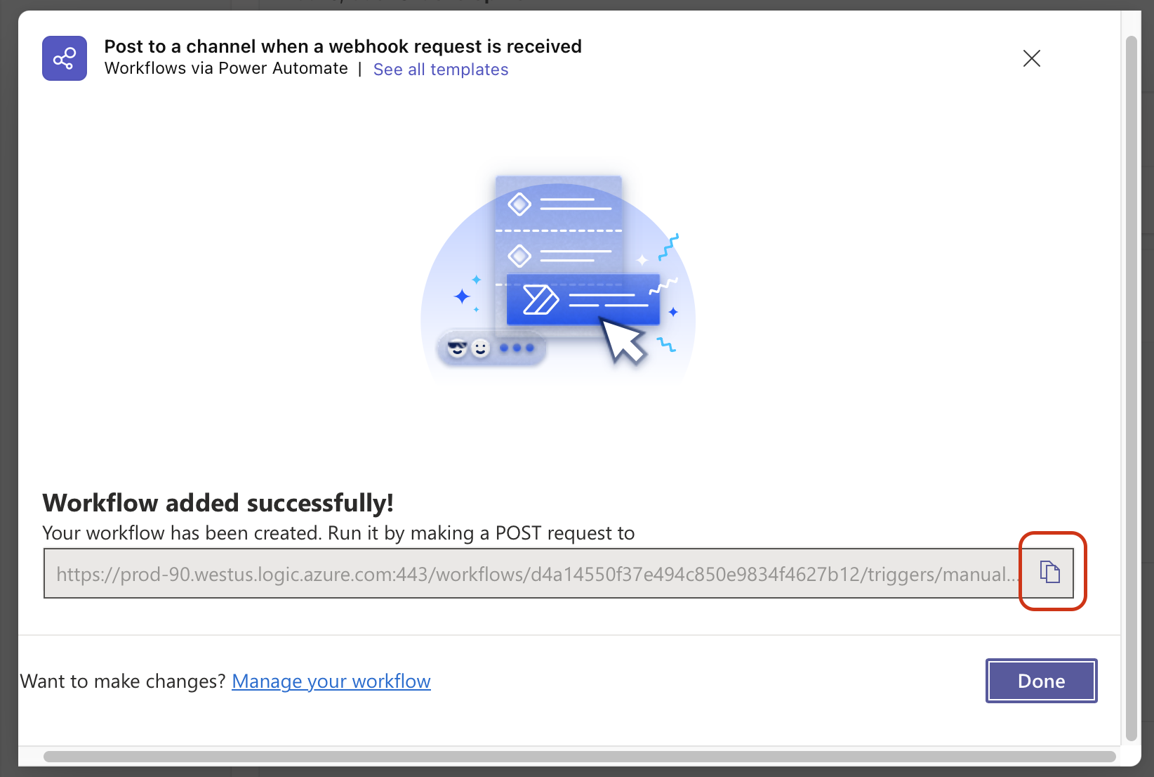 Wait until Microsoft Teams added the workflow, copy the webhook url and click on Done. This URL is used in the Dash0 Notification Channel configuration for the field URL.