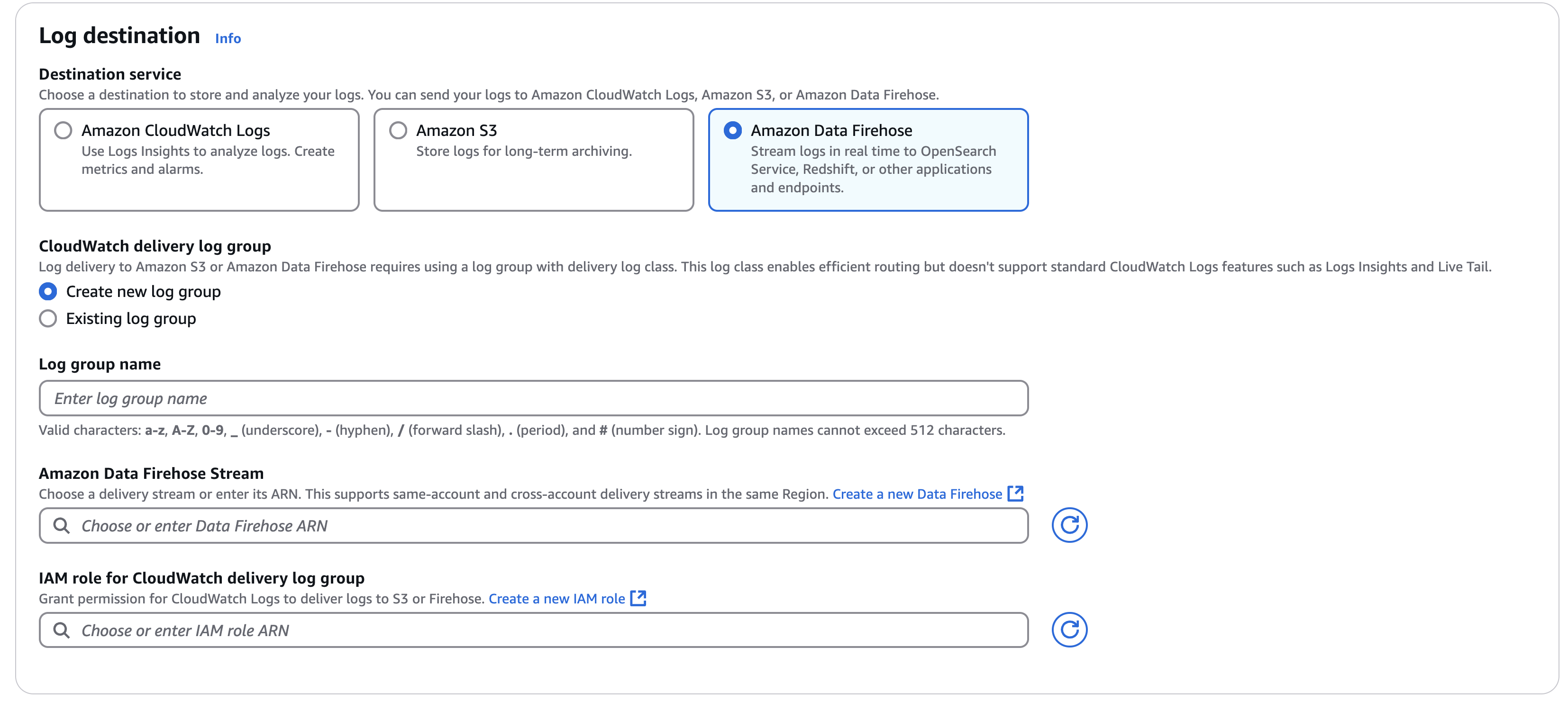 3. Select Firehose as the log destination