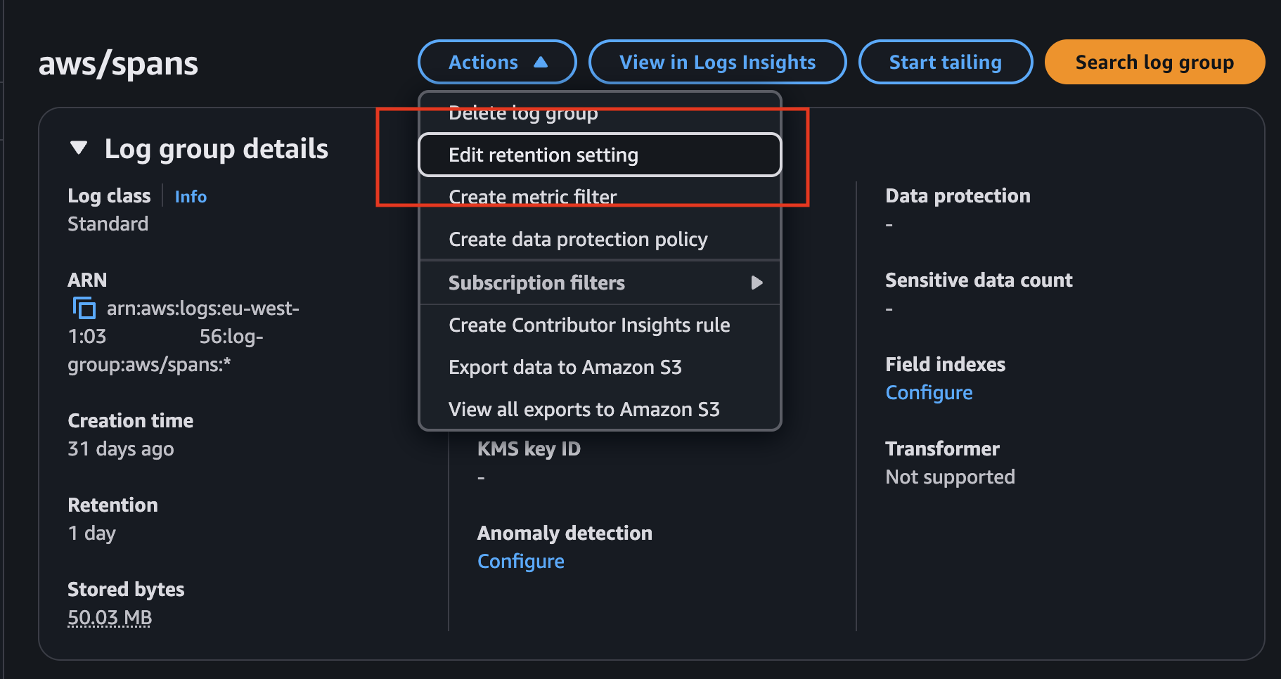 aws/spans log groupTo manage costs and avoid excessive data retention, set a retention policy for the aws/spans log group:
