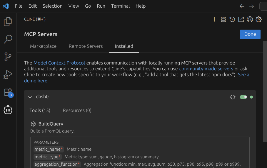 Cline can be connected to Dash0 using our hosted MCP server, allowing it to get context about your telemetry data, navigate and analyze it, while leveraging the same capabilities that human users have access to in the UI.