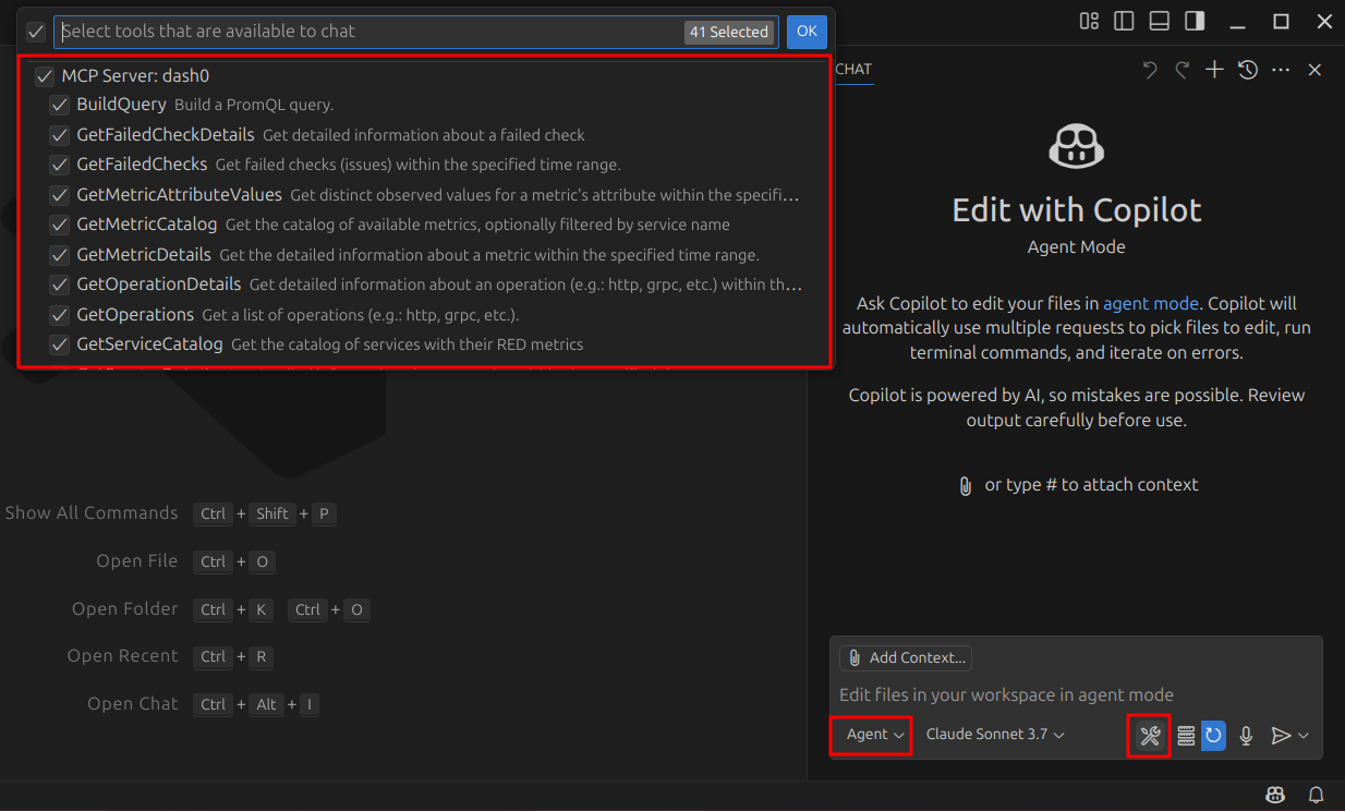 To confirm that the Dash0 MCP server has been configured: Open the Copilot panel on Agent mode, then click on the icon to Configure Tools... and scroll down to see the tools for the Dash0 MCP server: