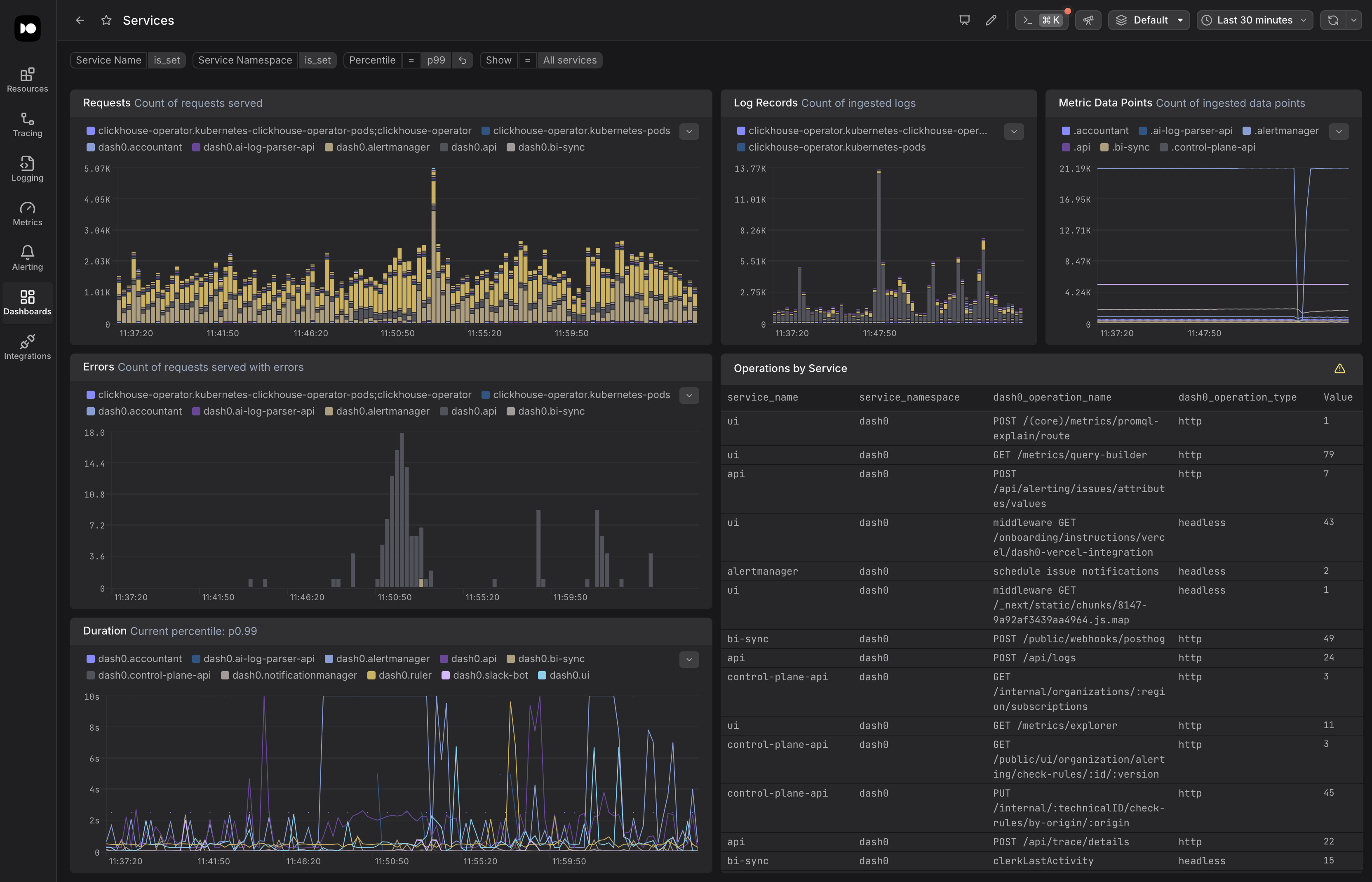 Request, Error and Duration metrics across your services, correlated with logging, tracing and metrics data. All in one place.