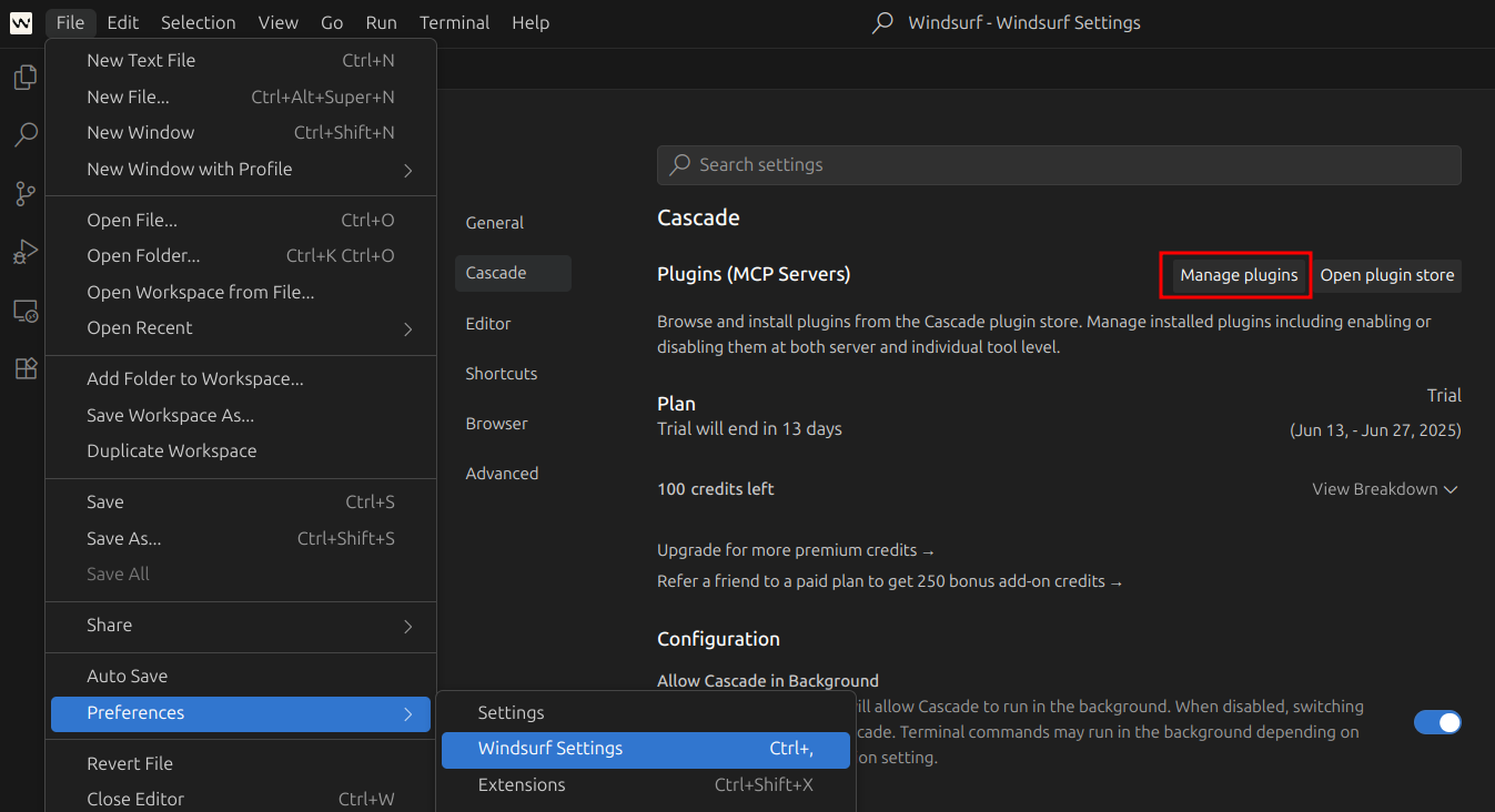 In the Windsurf editor, click on File > Preferences > Windsurf Settings > Cascade > Manage plugins