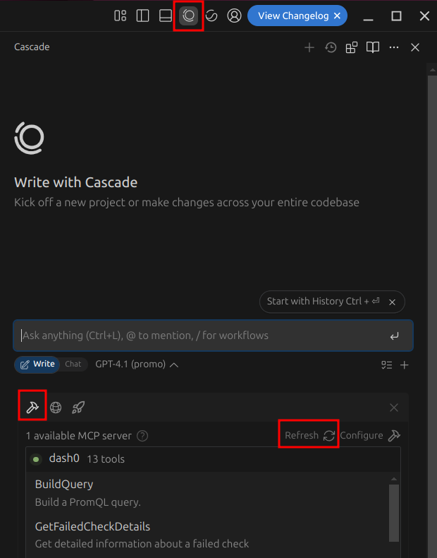 From the Cascade coding assistance panel, click on the MCP Servers icon, then on Refresh to load the new configuration.