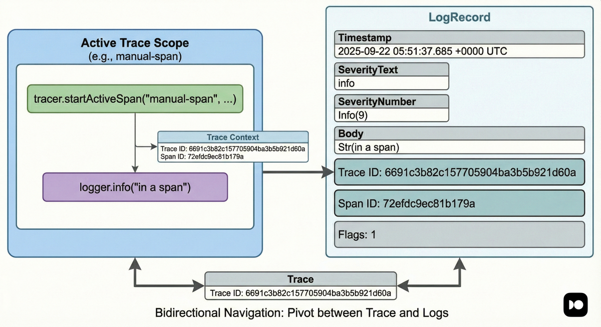 The most important innovation is automatic correlation with traces. When logs are emitted within an active trace, OpenTelemetry automatically attaches trace and span identifiers to each log record, making it possible to: