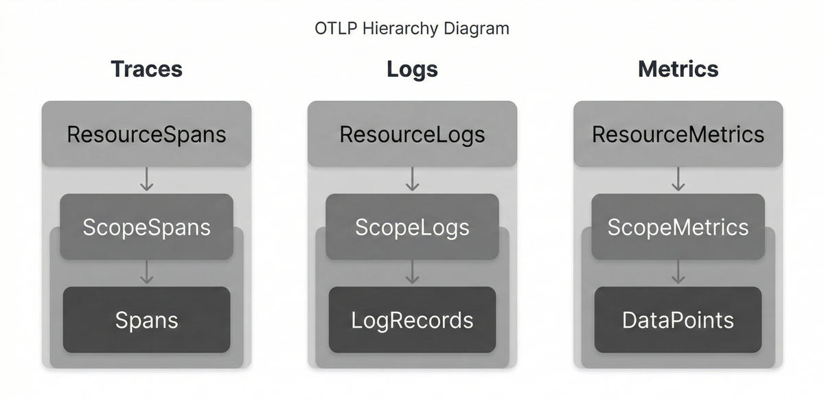 To really understand OTLP, you need to look at the shape of the data it carries. The protocol isn't just about moving bytes across the wire; it defines a hierarchical model that wraps every trace, metric, and log in the context you need to make sense of it. Without that context, your telemetry is just noise. With it, you get signals you can actually correlate and act on.
