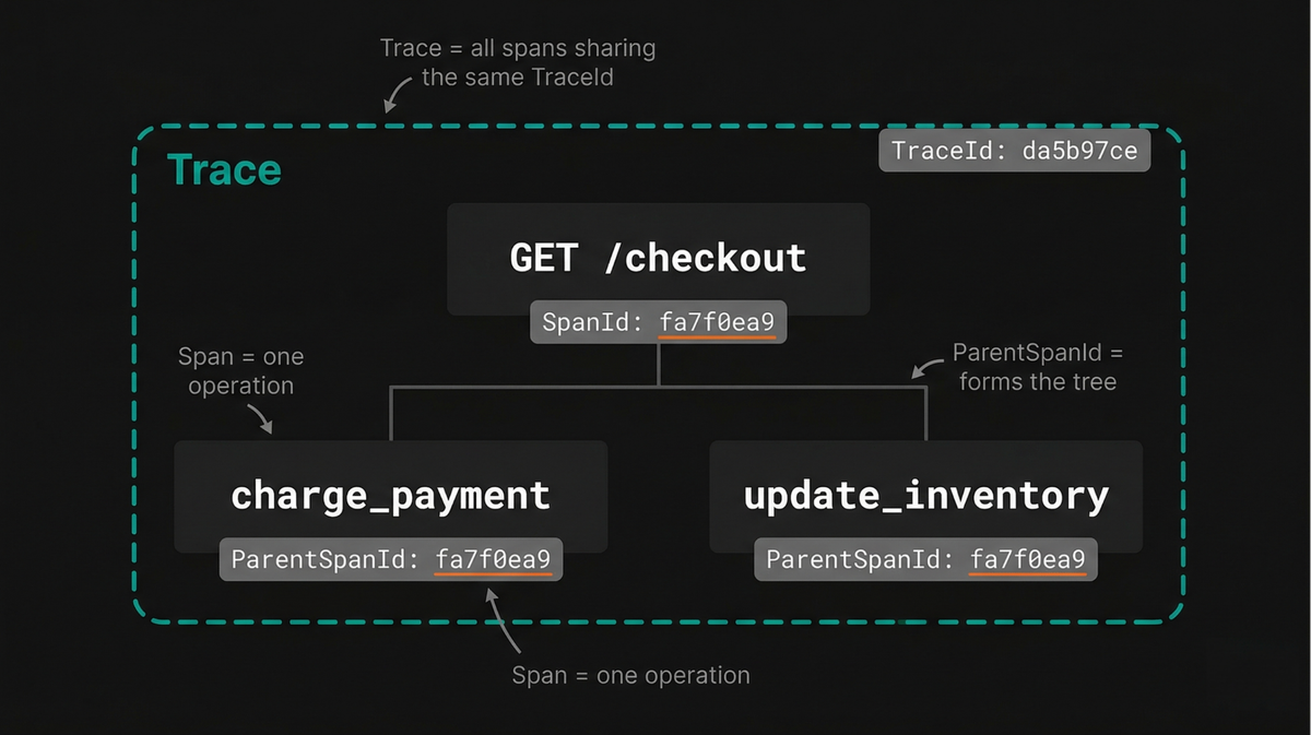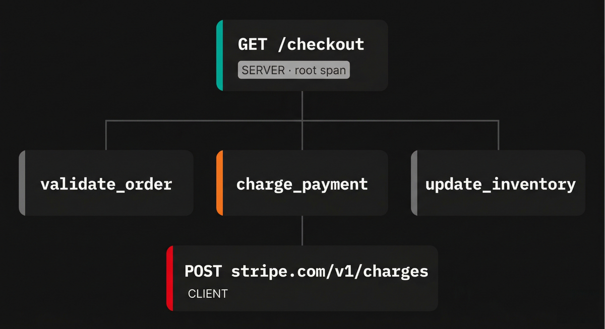 Consider a request to a checkout endpoint that validates the order, charges a payment provider, and updates inventory. The root span represents the full HTTP request, with child spans for each of these steps.