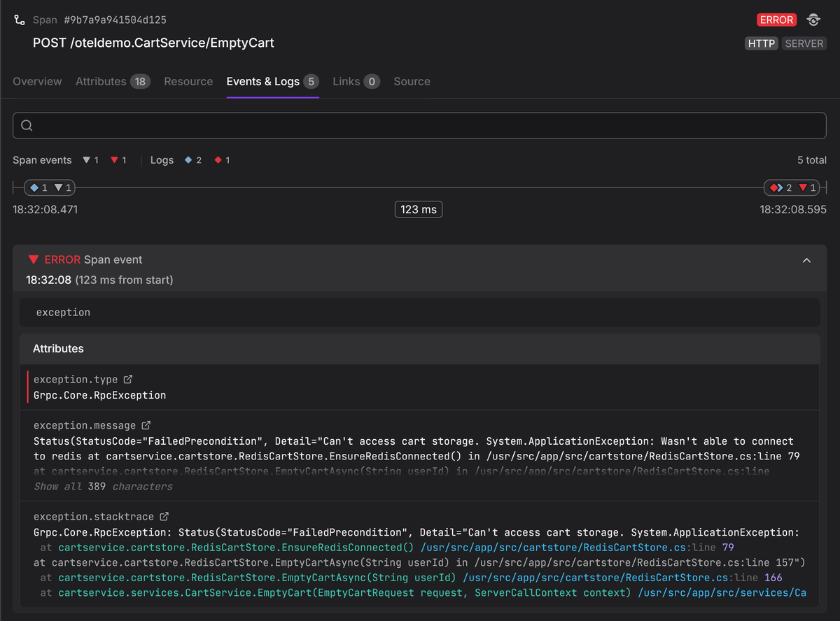 1234567891011// These methods should no longer be used in new codespan.addEvent("cache.miss", {"cache.key": `user:${userId}`,"cache.backend": "redis",});try {// Some operation} catch (err) {span.recordException(err);}