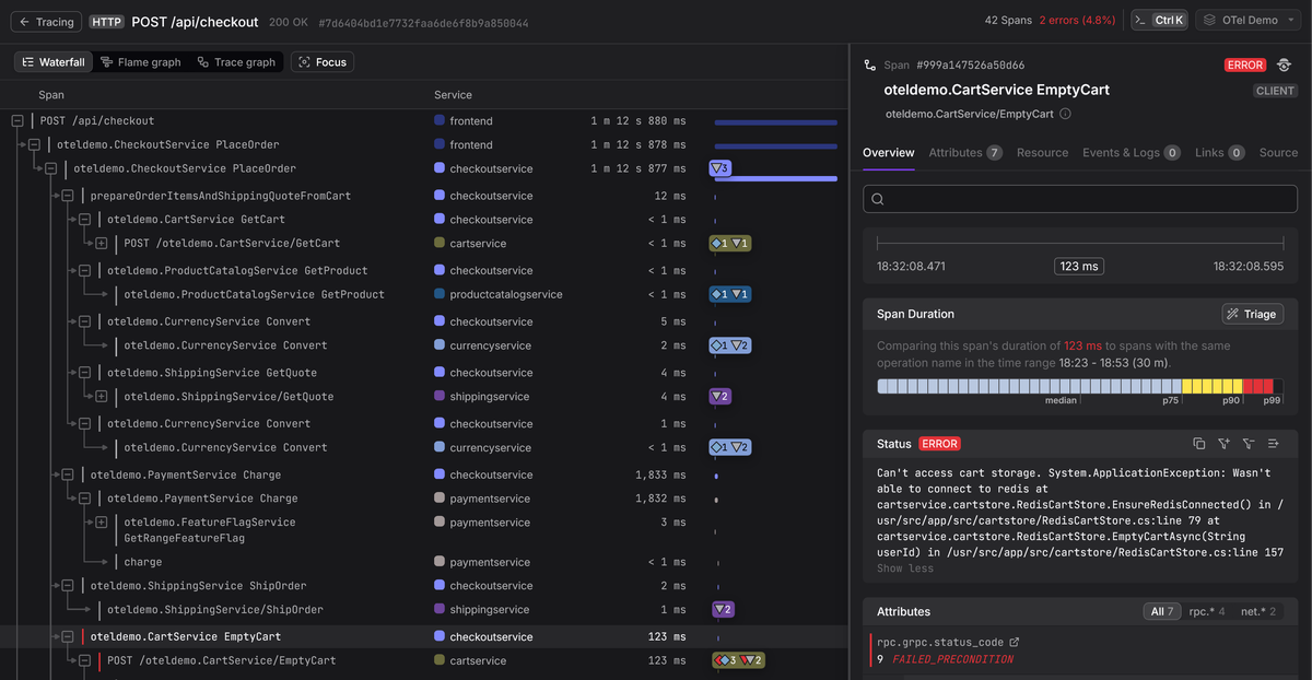 Understanding span fields in the abstract is useful, but the payoff comes when you use them to diagnose production issues. When a trace arrives in an OpenTelemetry-native backend, each span's full structure is preserved: identifiers, timing, attributes, events, status, and links.