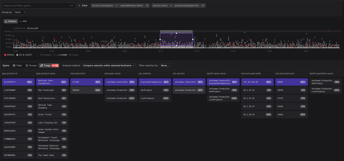 the metadata and tells you, for example, that 100% of the failing spans share a