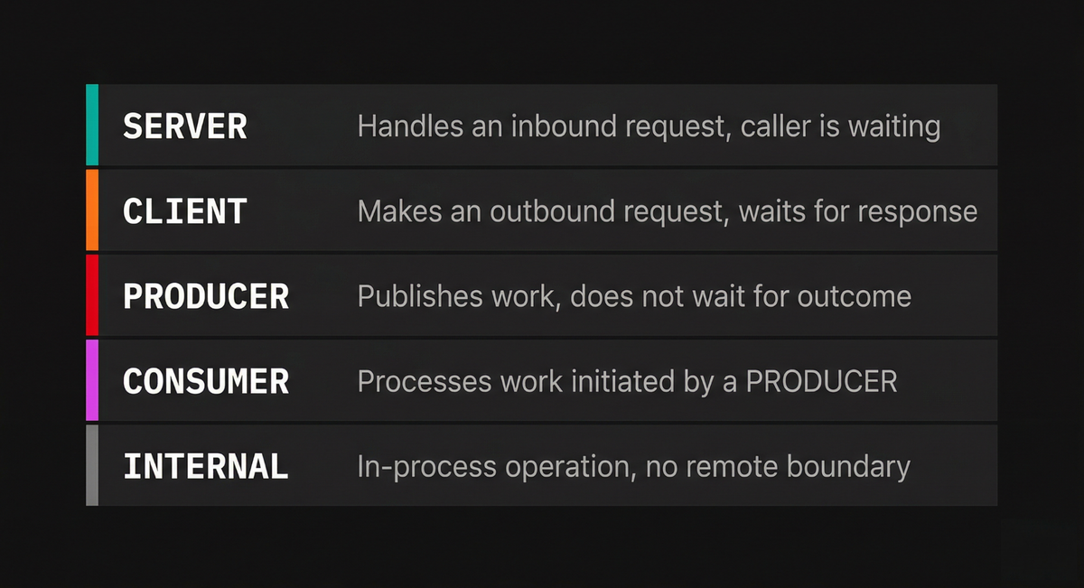 INTERNALis the default. It indicates an operation that stays within the boundaries of a single application, with no remote parent or child. Manual spans for business logic typically use this kind.