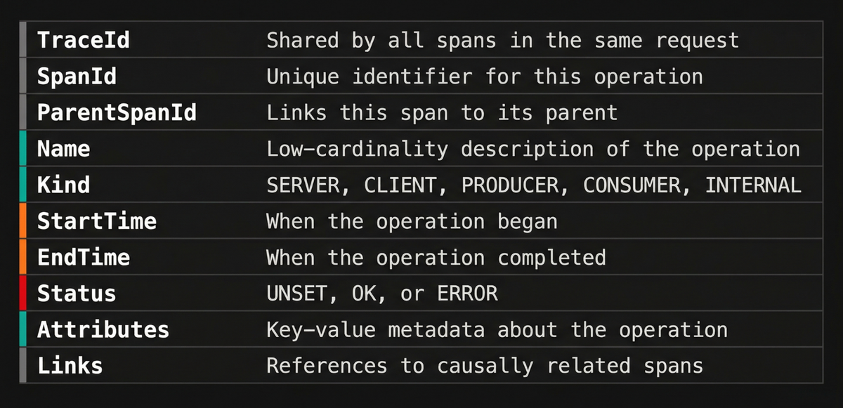 The OpenTelemetry specification defines a set of fields that every span carries. A good way to understand them is by grouping according to the questions they answer: